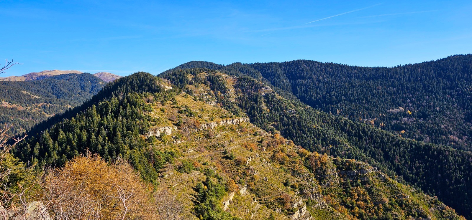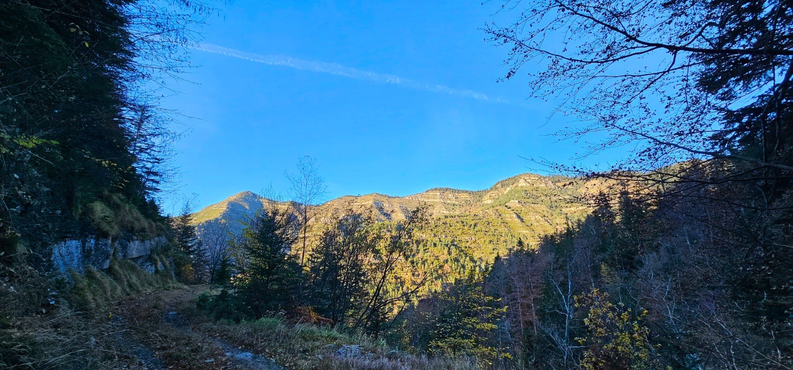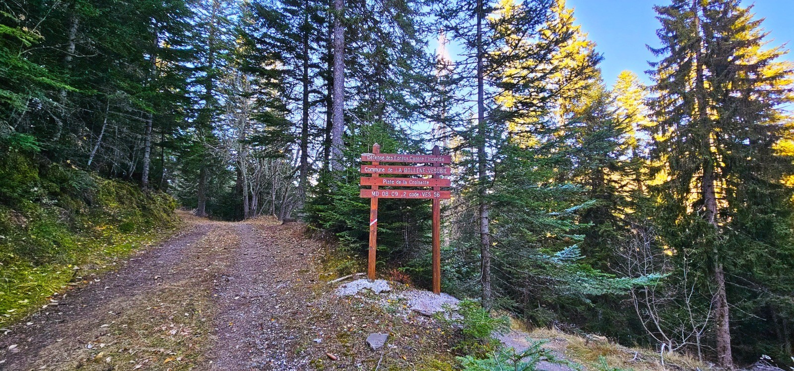 Longue et douce descente sur 5,83 km jusqu'à la balise 174. Première phase avec cheminement en balcon sur l'adret du massif précédemment parcouru, en longeant les beaux vestiges des Granges de Suorcas. La végétation méditerranéenne de ce versant ensoleillé renoue vers le km 13 avec la forêt communale de Lantosque et ses sapins géants. Superbe environnement automnal ! La partie finale du parcours débute à la balise 174 qui n'est pas numérotée sur le terrain et qui est constituée d'un poteau à flèche directionnelle orientée vers "Peïra Cava" par un chemin qui grimpe sur la gauche. Pente à 20 % sur 1,32 km avec d+ 266 m qui est la plus prononcée de ce circuit qu'elle clôture avec un rare temps fort ascensionnel.
