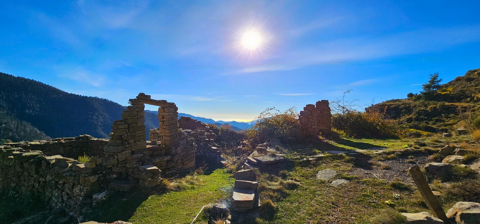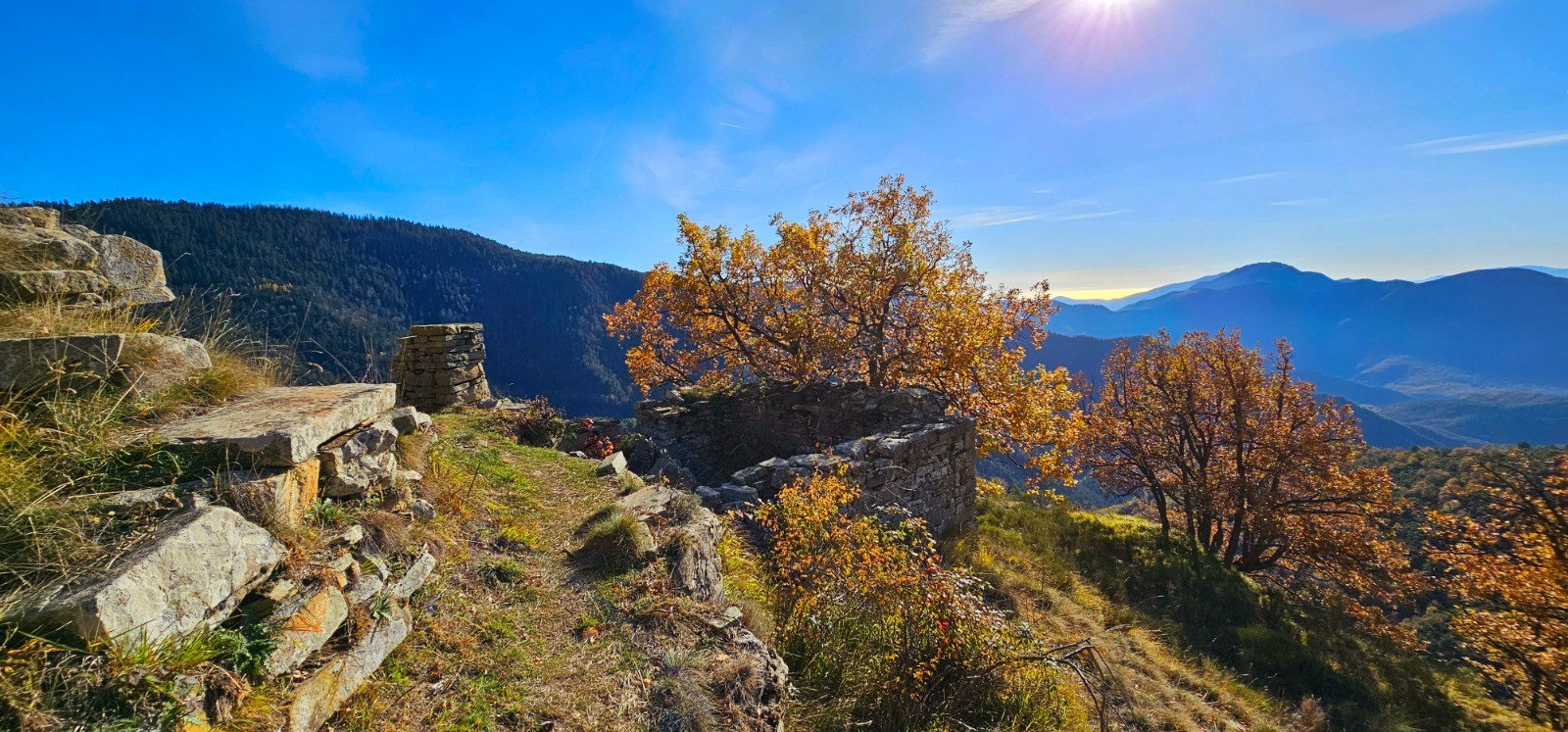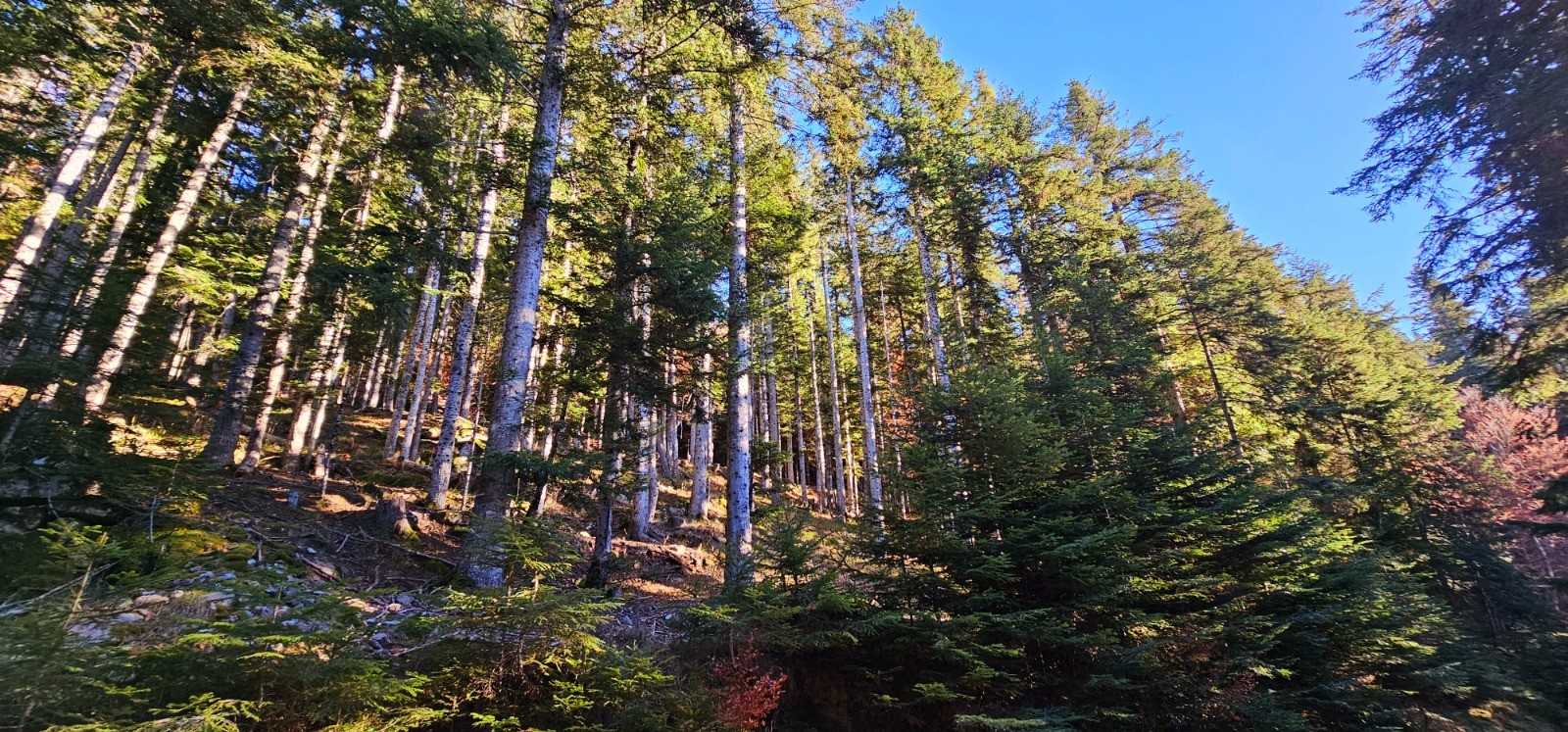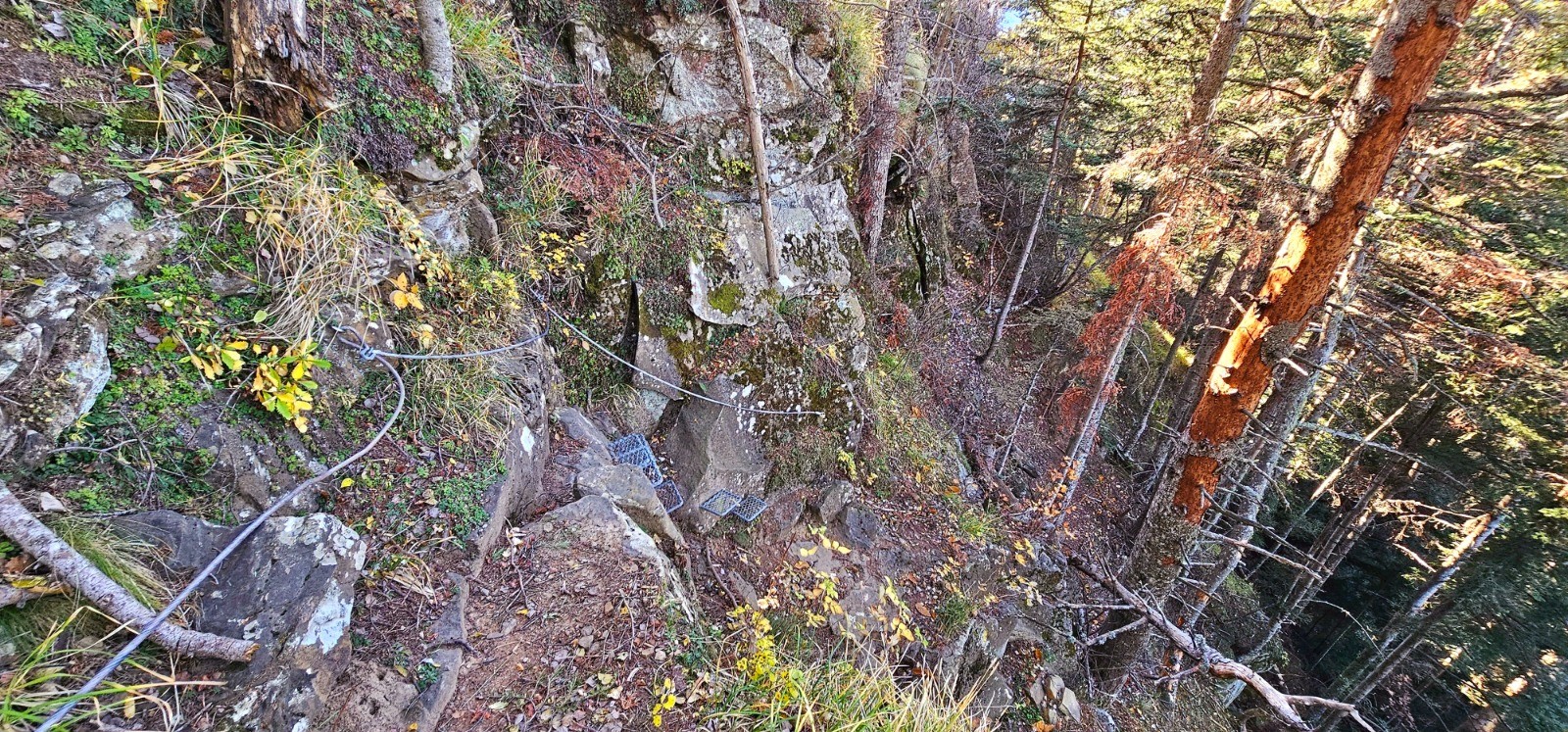 Longue et douce descente sur 5,83 km jusqu'à la balise 174. Première phase avec cheminement en balcon sur l'adret du massif précédemment parcouru, en longeant les beaux vestiges des Granges de Suorcas. La végétation méditerranéenne de ce versant ensoleillé renoue vers le km 13 avec la forêt communale de Lantosque et ses sapins géants. Superbe environnement automnal ! La partie finale du parcours débute à la balise 174 qui n'est pas numérotée sur le terrain et qui est constituée d'un poteau à flèche directionnelle orientée vers "Peïra Cava" par un chemin qui grimpe sur la gauche. Pente à 20 % sur 1,32 km avec d+ 266 m qui est la plus prononcée de ce circuit qu'elle clôture avec un rare temps fort ascensionnel.