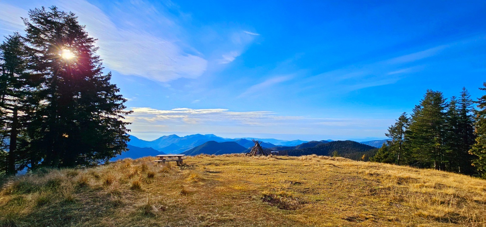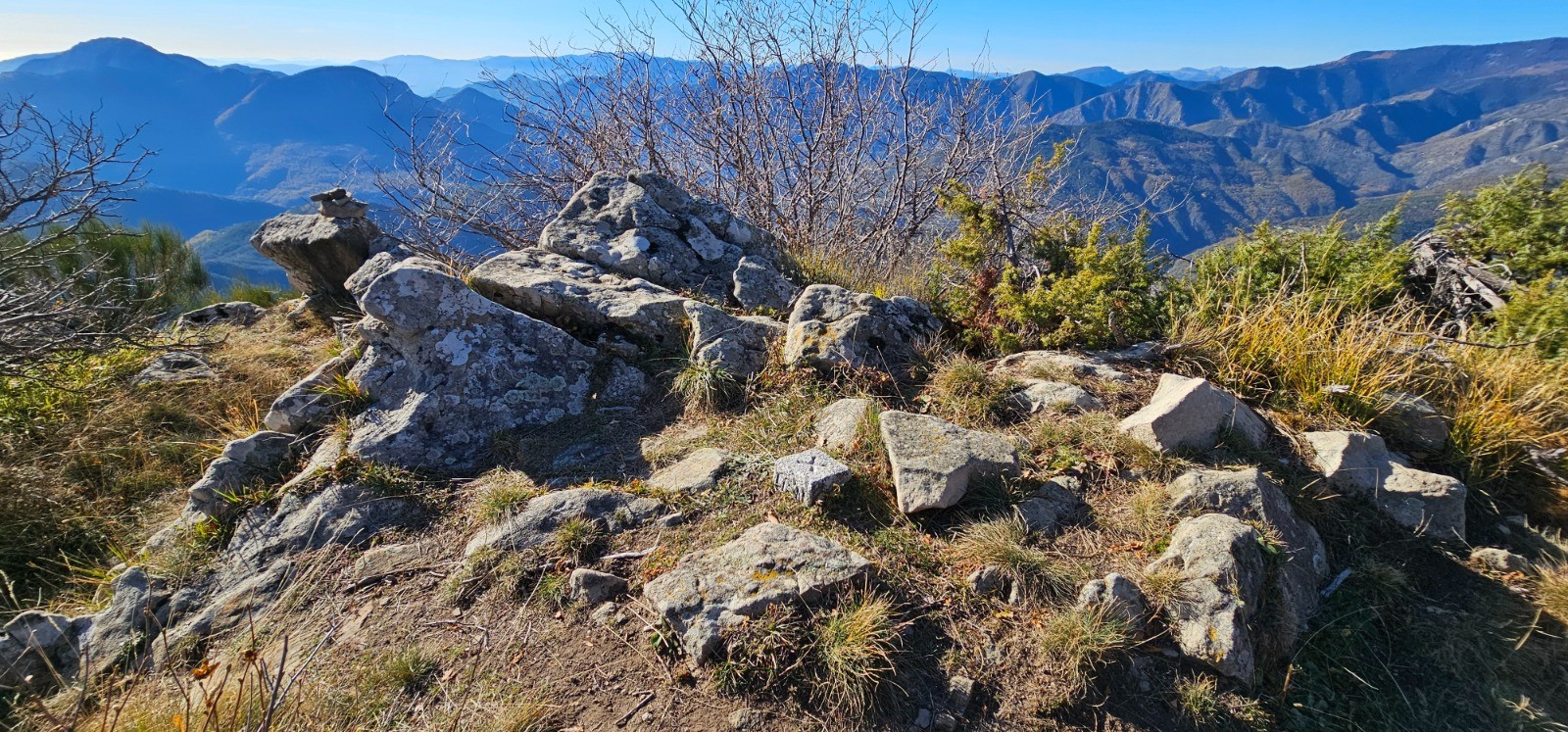 Montée facile vers la cime de la Calmette à partir de la balise 182 en passant par la cime de l'Escaillou qui n'est qu'une simple éminence de cette ligne de crête. La Calmette constitue le point culminant de cette rando avec ses 1786 m et ses abords sont de toute beauté. Vaste prairie précédant ce point haut aménagé avec un "circuit musical" et une table d'orientation dans un cadre splendide. Panorama à perte de vue sur tous les massifs du bas pays avec la Corse et le Mont Cinto qui se détachent en ligne d'horizon.