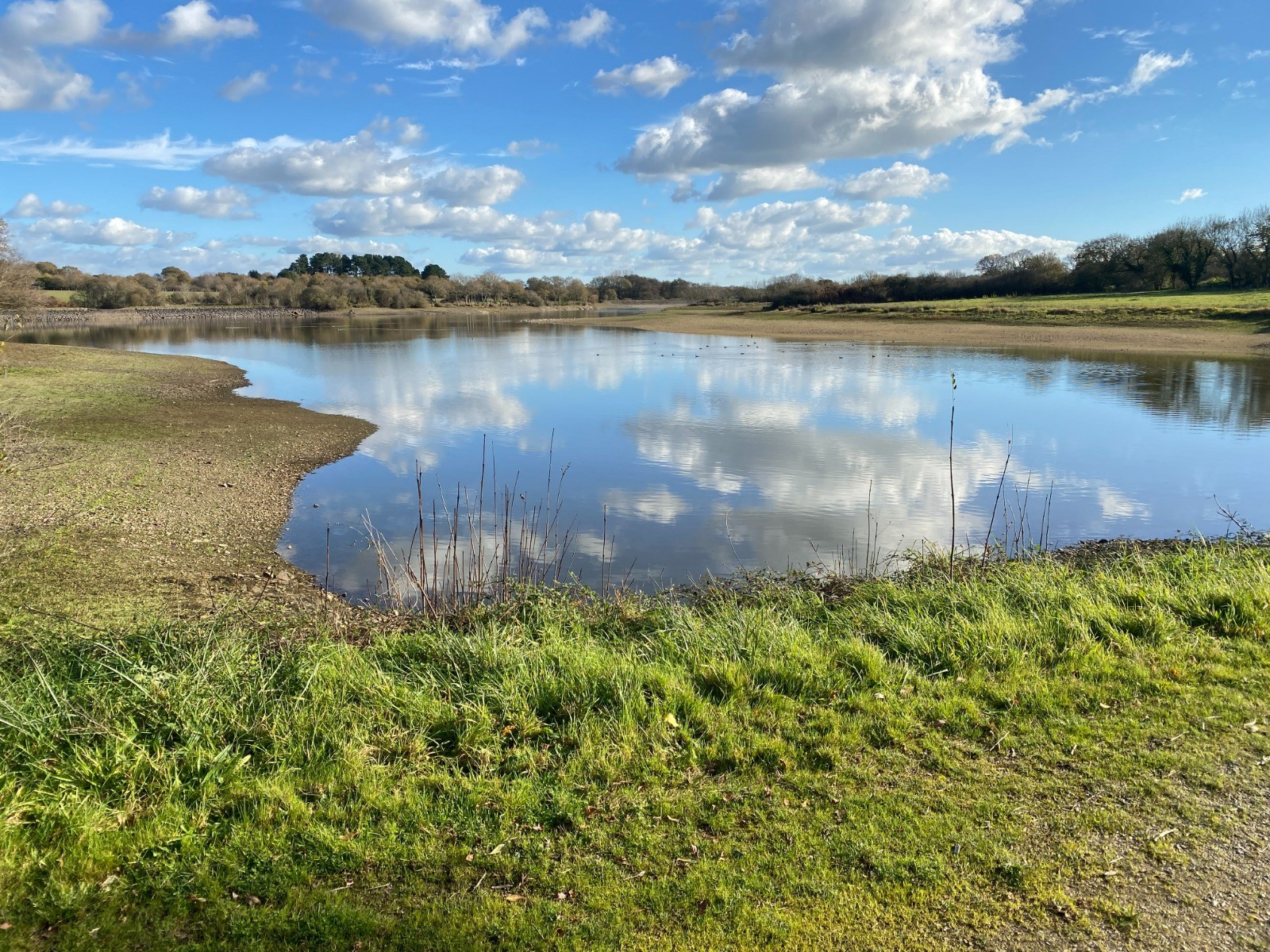 Les reflets du ciel s’y déploient largement, créant une atmosphère sereine et presque immobile.