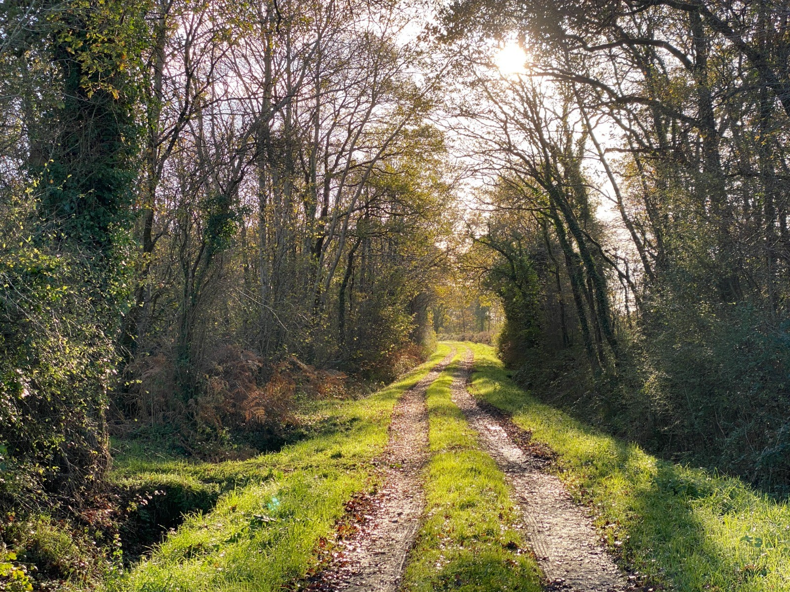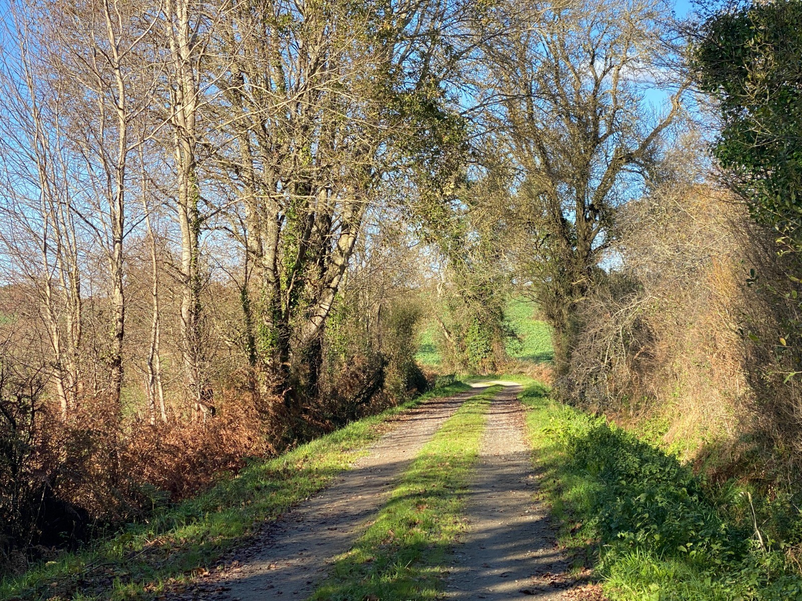 Le sentier serpente d’abord entre des haies bocagères épaisses, où s'entremêlent chênes, aubépines et prunelliers.