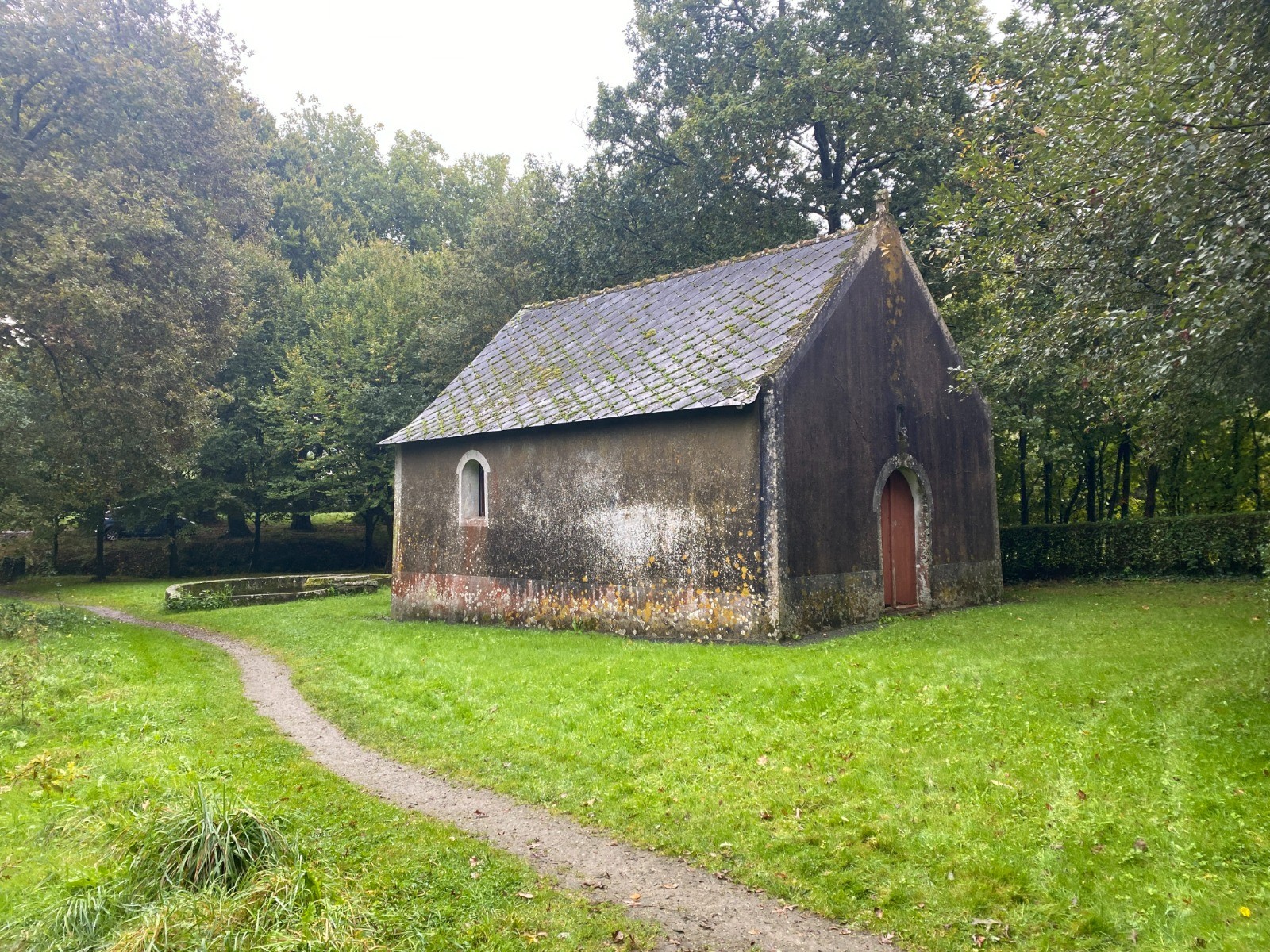 Construite au XVIIe siècle, la chapelle est simple, dépouillée, avec son toit à deux pans et sa façade couronnée d’une petite croix en pierre. Aucun clocher, aucune dorure, juste le murmure du vent et le craquement des arbres qui l’entourent.