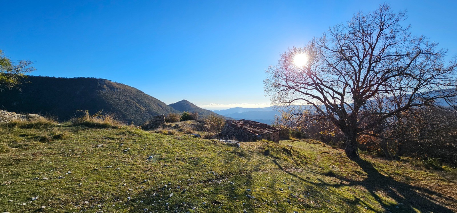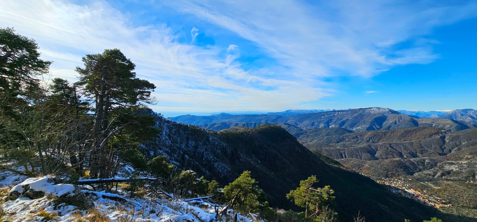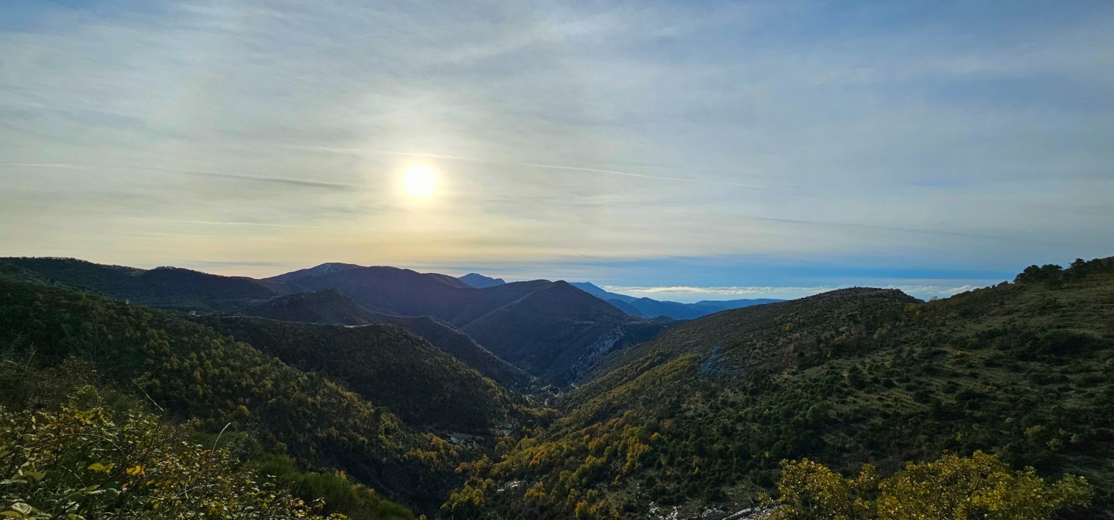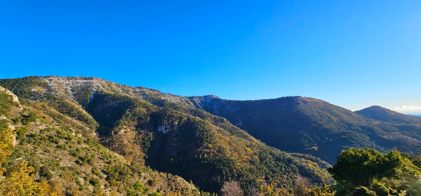 Descente continue pour phase retour avec belle pente boisée (pinèdes) et versants ensoleillés avec splendides points de vue sur le vallon du Paillon et Lucéram. Belle grange au lieu-dit Le Clapou lors de la descente.