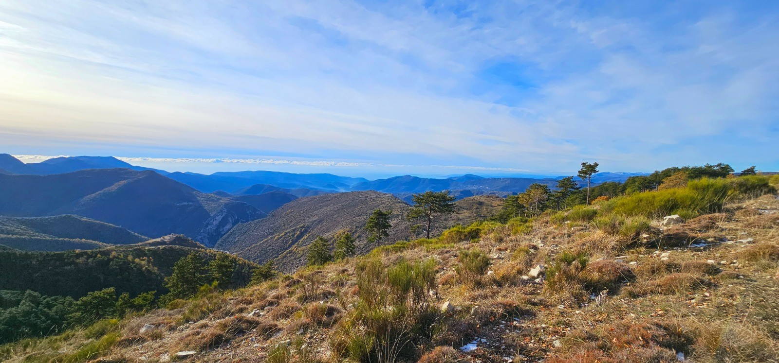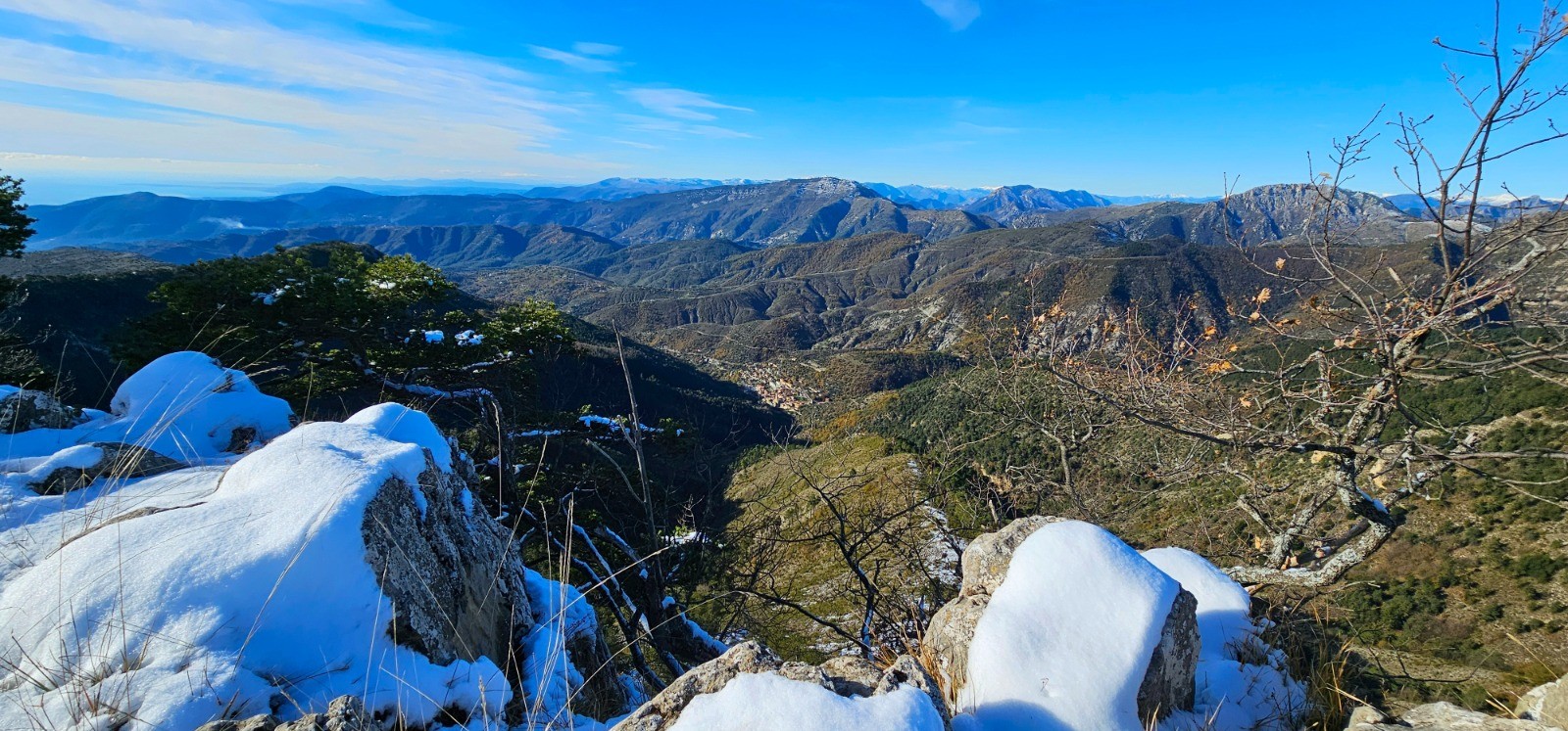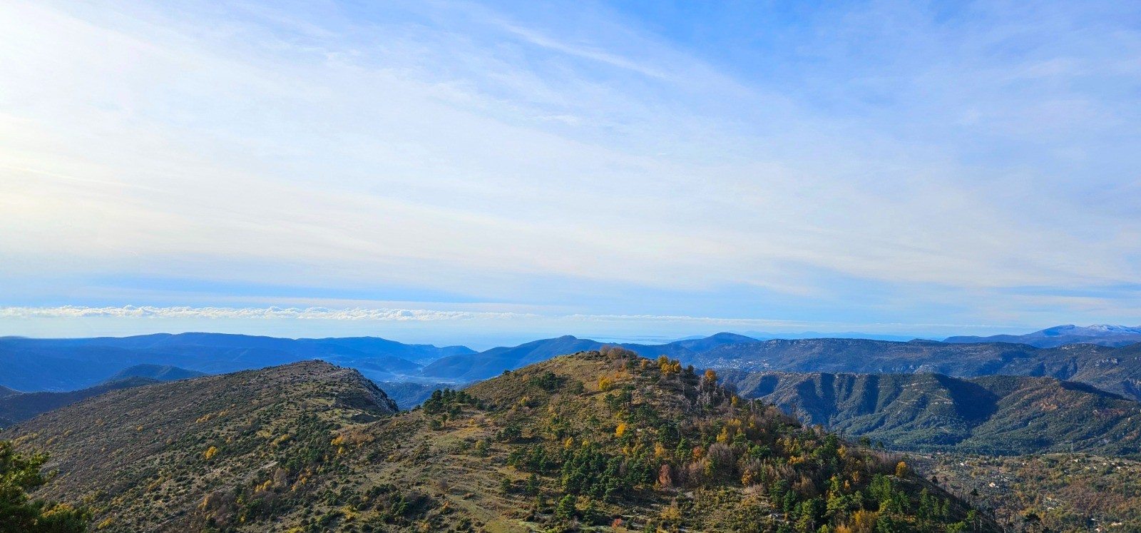 Descente continue pour phase retour avec belle pente boisée (pinèdes) et versants ensoleillés avec splendides points de vue sur le vallon du Paillon et Lucéram. Belle grange au lieu-dit Le Clapou lors de la descente.