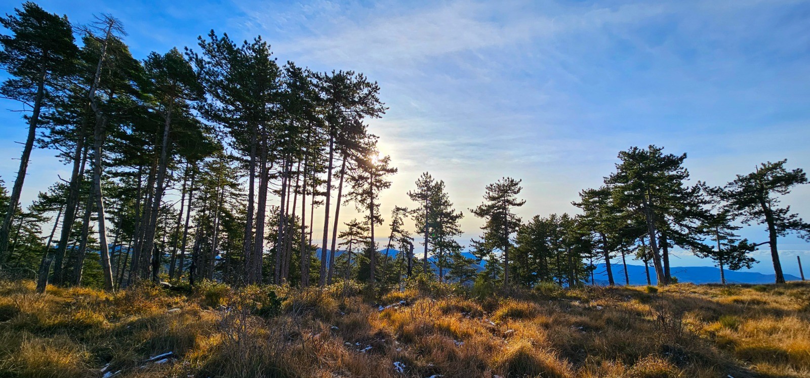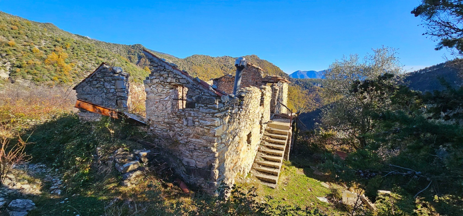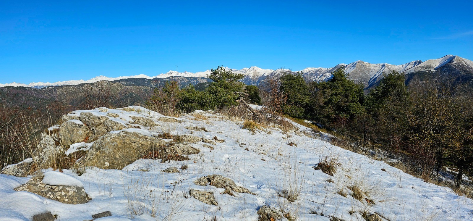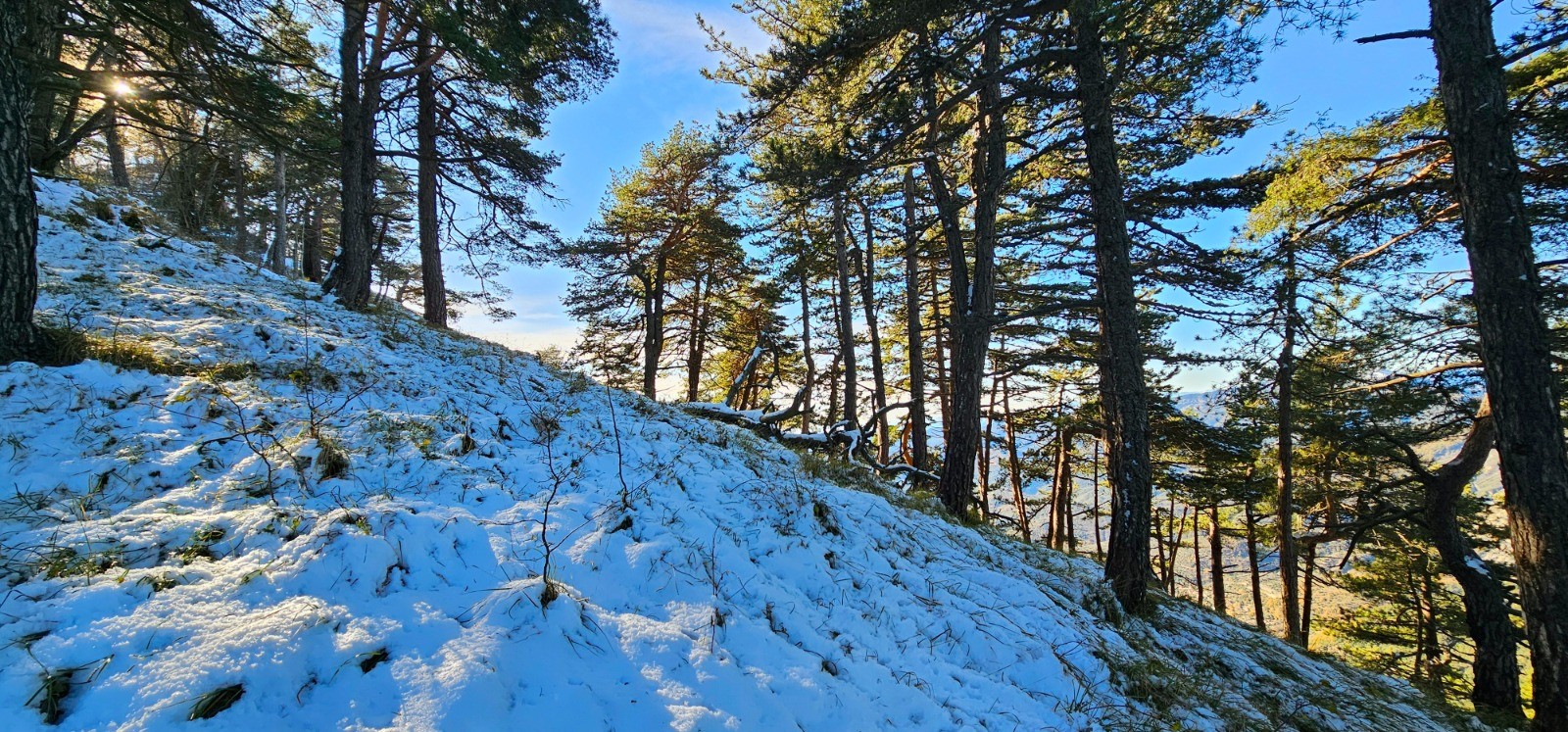 Descente continue pour phase retour avec belle pente boisée (pinèdes) et versants ensoleillés avec splendides points de vue sur le vallon du Paillon et Lucéram. Belle grange au lieu-dit Le Clapou lors de la descente.