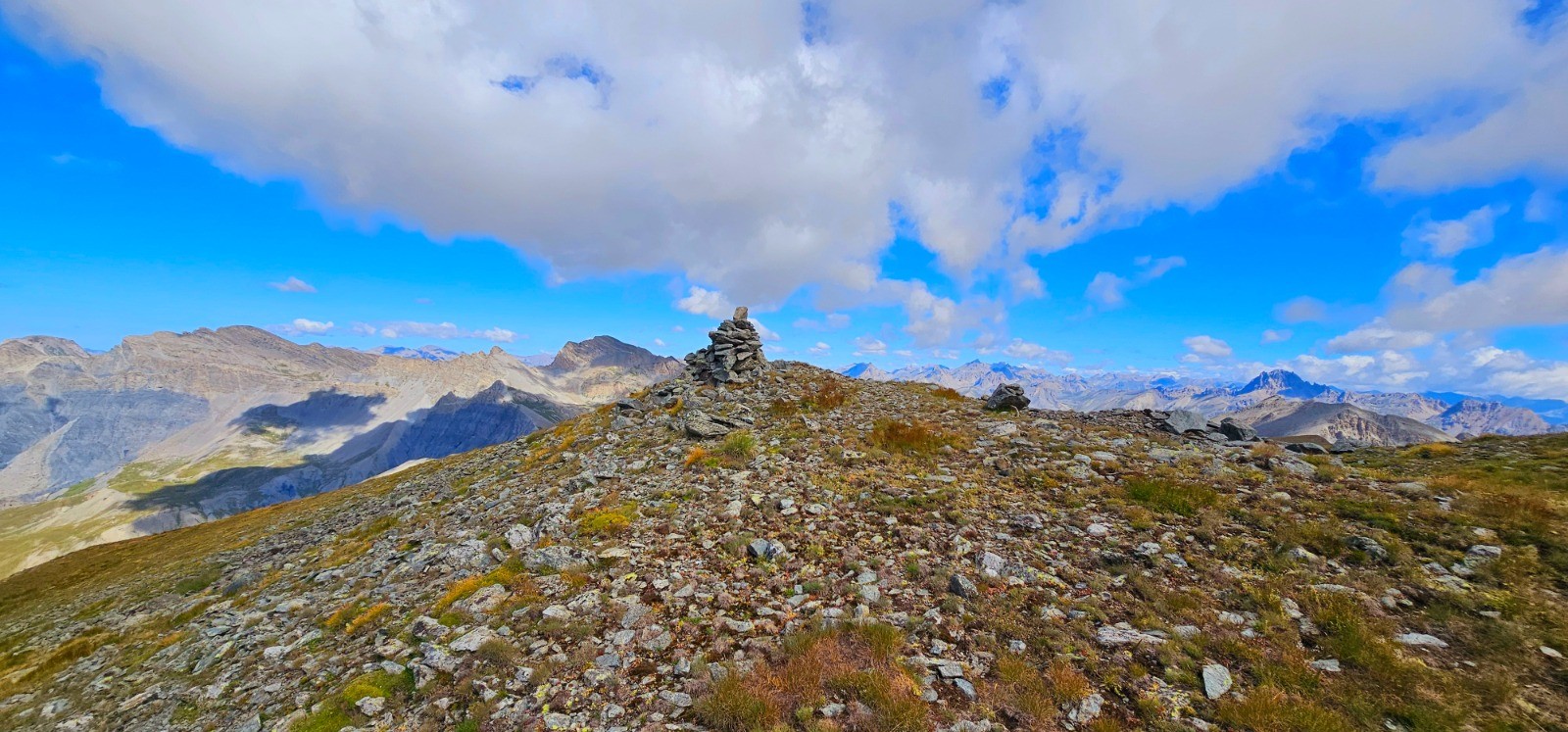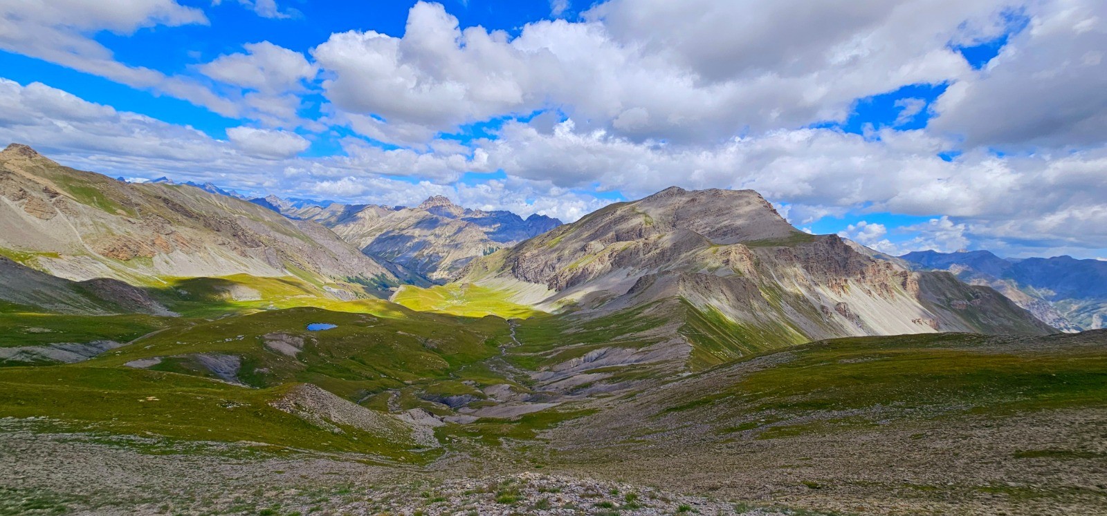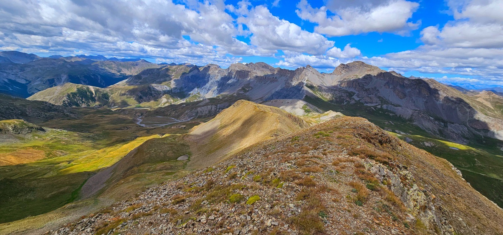 Circuit en demi boucle dans la Haute Tinée pour ascension du sommet franco-italien du Mont Aiga avec une superbe ligne de crête frontalière de 3,3 km entre le Pas de Gorgeon Long et le col de Pouriac, via le Pel Brun, dans le secteur agro-pastoral réputé du Salso Moreno. Site inclassable d'une stupéfiante beauté qui ne laisse personne indifférent (immensité des paysages parsemés de lacs, chaînes majestueuses avec sommets emblématiques en ligne d'horizon, Viso, Tête de l'Enchastraye, etc... qui concourent à la magnificence de ce parcours). Evolution dans zone coeur du Parc National du Mercantour.