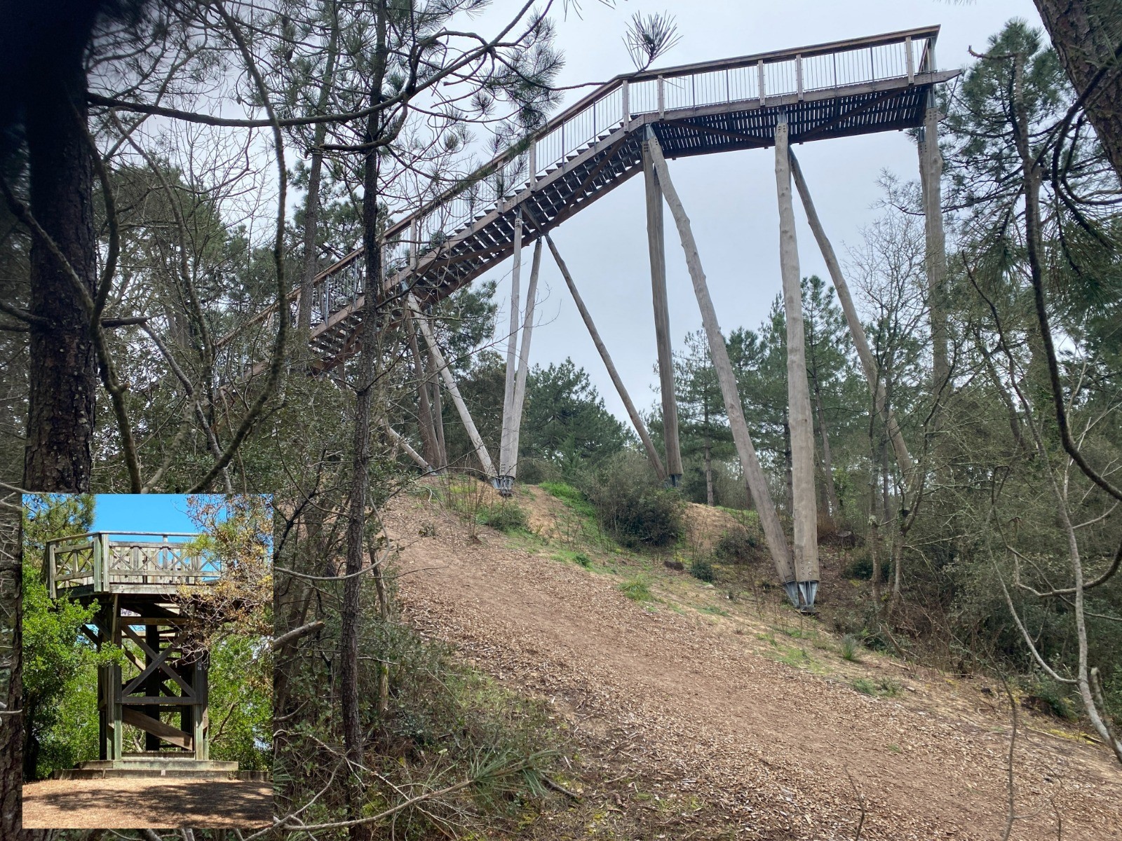 Fabriqué avec des bois de chênes, douglas et châtaignier, le nouveau belvédère du Pey de la Blet culmine désormais à 37m de hauteur, offrant une vue imprenable par-dessus la forêt, d'un côté vers le pont de Noirmoutier, et à l'opposé vers le marais breton vendéen.