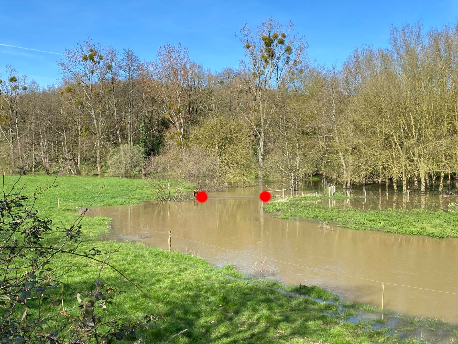 Mais aujourd’hui l’Erdre déborde et même avec des bottes cela serait délicat voire dangereux ( photo no 11 - Points rouges : le soi-disant pont )
