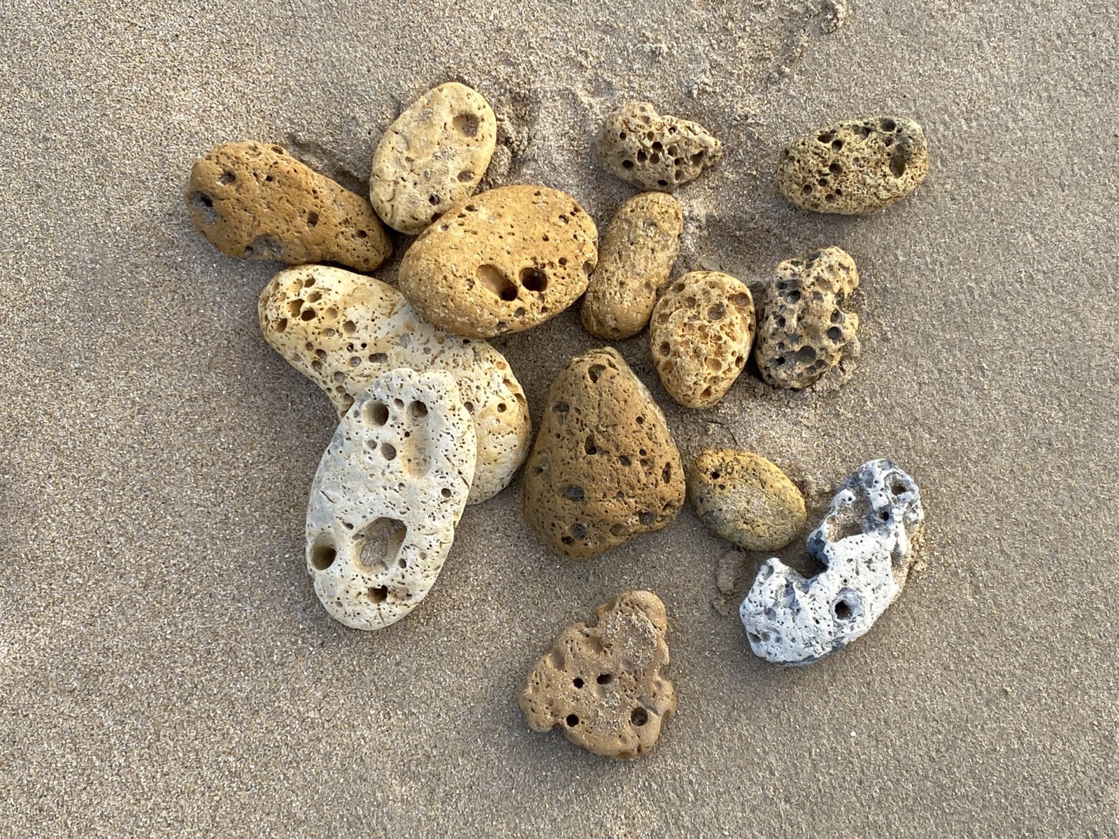 "Ces galets, initialement immergés avant d'être arrachés et roulés sur la plage, montrent pour un certain nombre d'entre eux des perforations dues à des pholades (bivalves marins)."