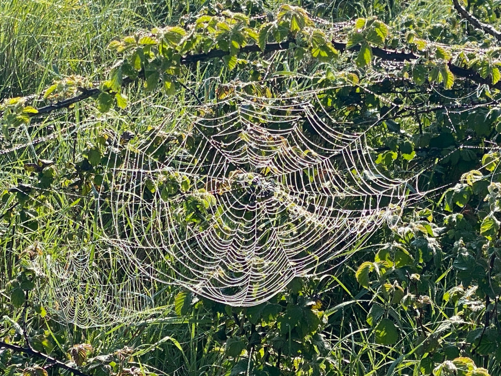 La fraîcheur du matin se fait sentir : la rosée perle sur l’herbe et de belles toiles d’araignées se dessinent. ( photos no 2 & 4 )