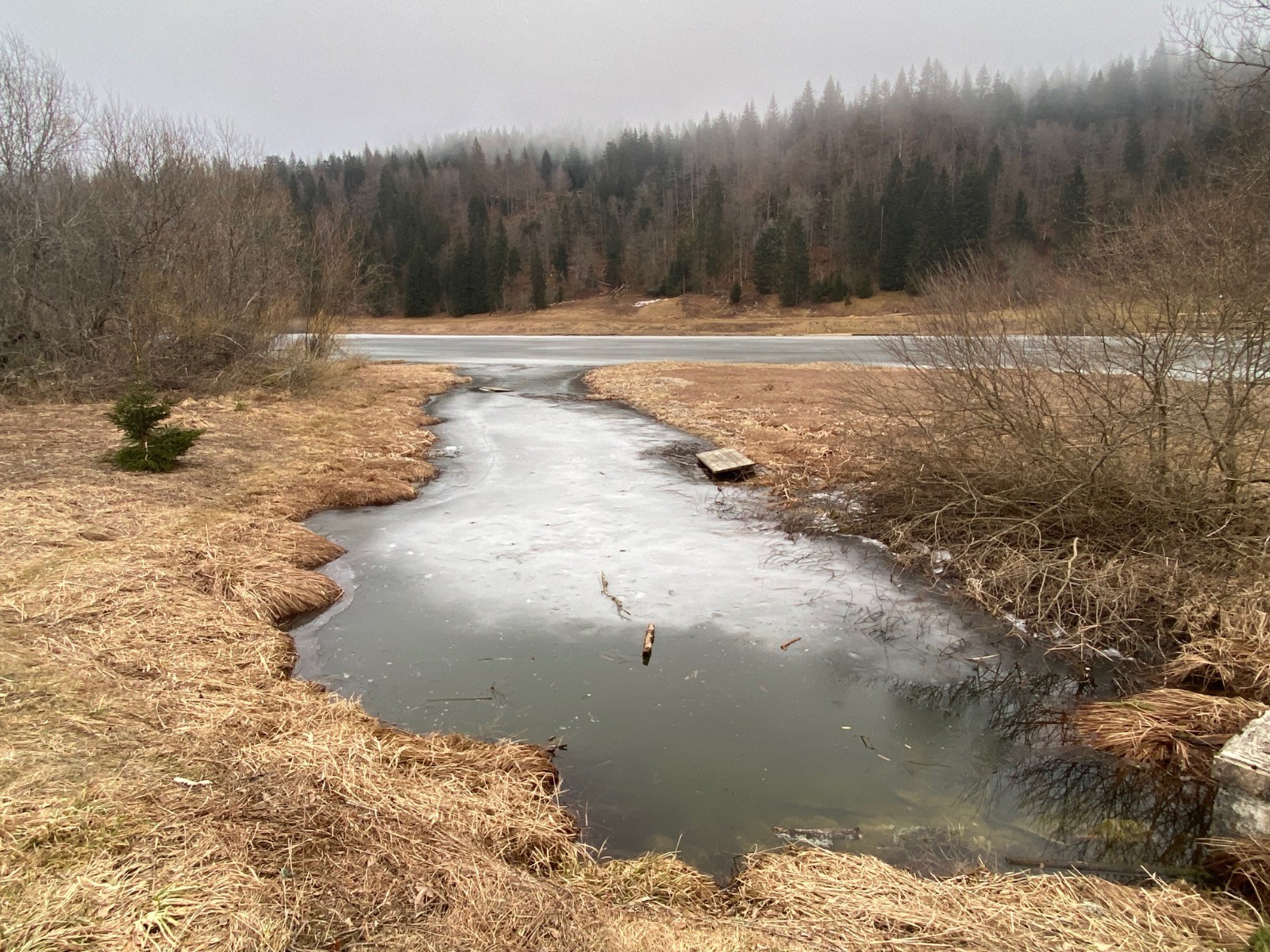 Le décor verdoyant ponctué des rougeurs des tourbières alentour où scintillent les eaux gelées du lac naturel le plus élevé du massif du Jura.