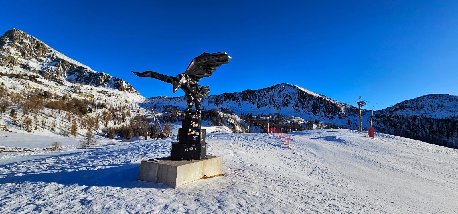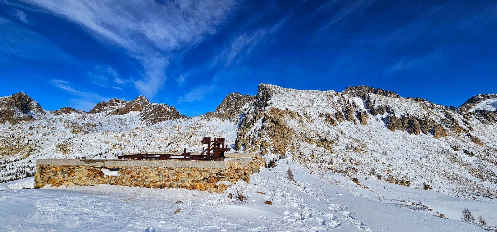 Début circuit par balise "90 a" contournant le chalet par la gauche avec brève partie forestière qui débouche précisément sur la sculpture remarquable de l"Aigle Niçois" à l'intersection d'une piste de ski qu'il convient de couper pour rejoindre la passerelle permettant de traverser le vallon de Terre Rouge. Retenue collinaire à proximité avec phase ascensionnelle jusqu'au sommet. Remonter au mieux les lignes d'épaulement sud-est du vallon depuis la partie haute du lac pour rejoindre un ancien casernement italien situé à 2277 m au-delà d'un vaste replat dont il ne demeure séparé que par un léger rideau d'arbres. Depuis ces vestiges, emprunter plein Est l'ancienne piste militaire qui vous mènera sans encombre au col Mercière par un lacet prononcé. Ne pas tenter d'y accéder par le PR estival qui est en dévers et exposé. Superbe ascension depuis ce col jusqu'au sommet de la Tête Mercière par une magnifique ligne de crête qui longe les limites de la zone coeur du Parc National du Mercantour et qui constitue la partie la plus spectaculaire de ce circuit. Evolution avec prudence d'usage en raison pentes accentuées versants nord et sud. A noter les blockhaus implantés sur le col et l'ancien téléphérique également construit par l'armée italienne, à 2372 m. Magnifique panorama depuis le cairn sommital sur les vallons de Mercière / Mollières au sud et sur l'ensemble du cirque d'Isola 2000 au nord avec les lacs de Terre Rouge et le mont Malinvern délimitant la frontière italienne au nord-est.