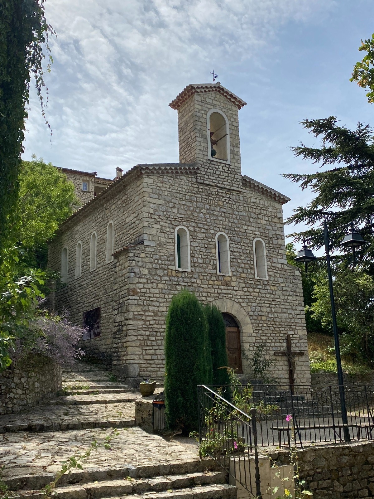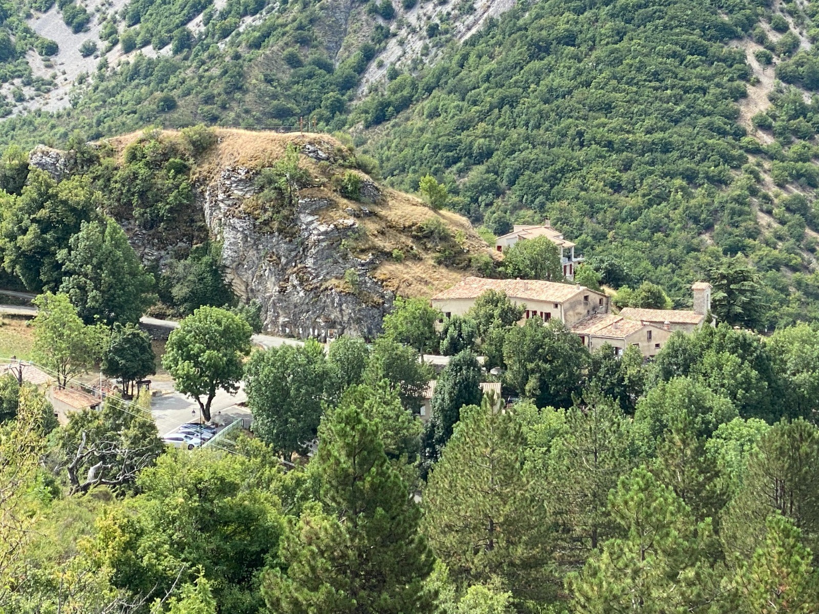 Il surplombe la vallée de l’Anary et ses pics rocheux pointant comme de gigantesques menhirs, au milieu des prés et des champs de lavande.