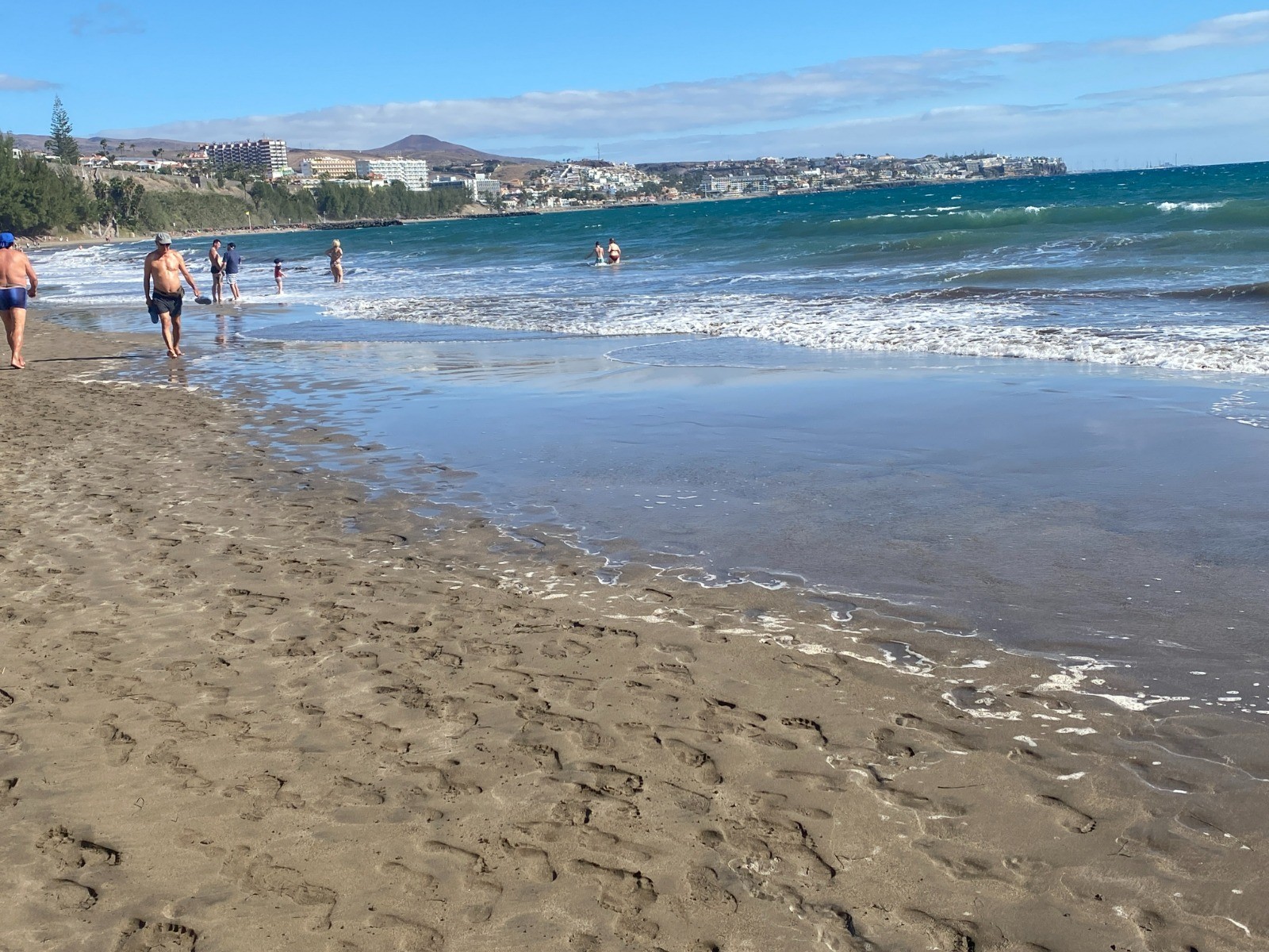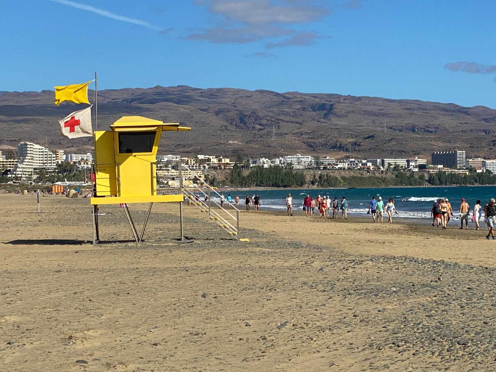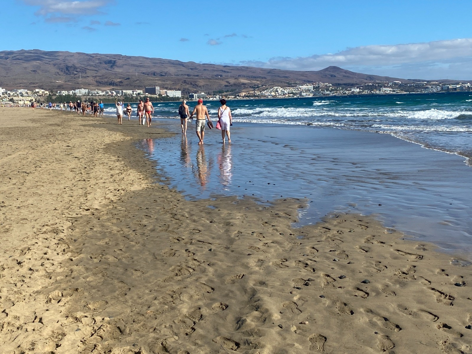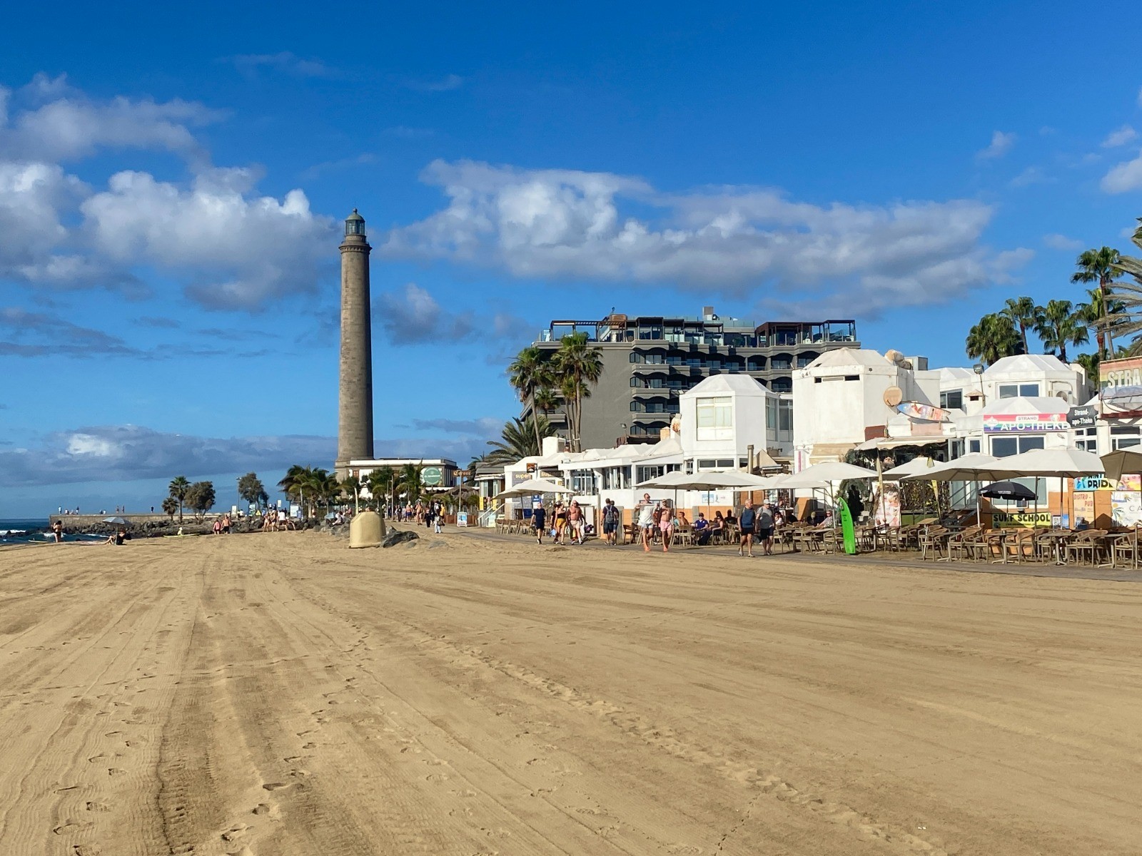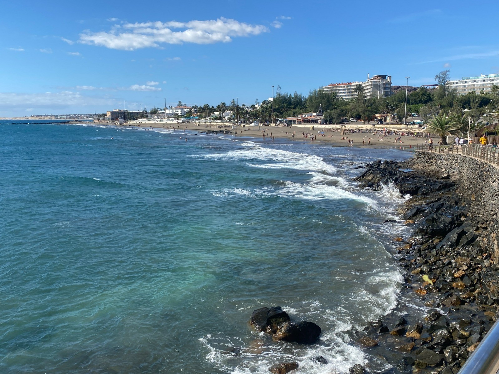 Après avoir rejoint la mer, vous longez la vaste Playa del Inglés, une plage large et animée : sable clair et fin, vagues régulières, ambiance détendue et bars et petites terrasses à quelques mètres.