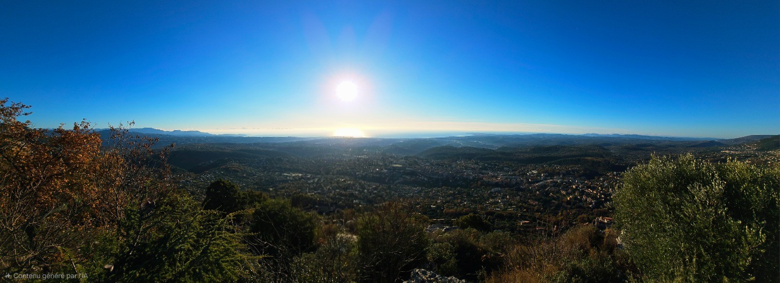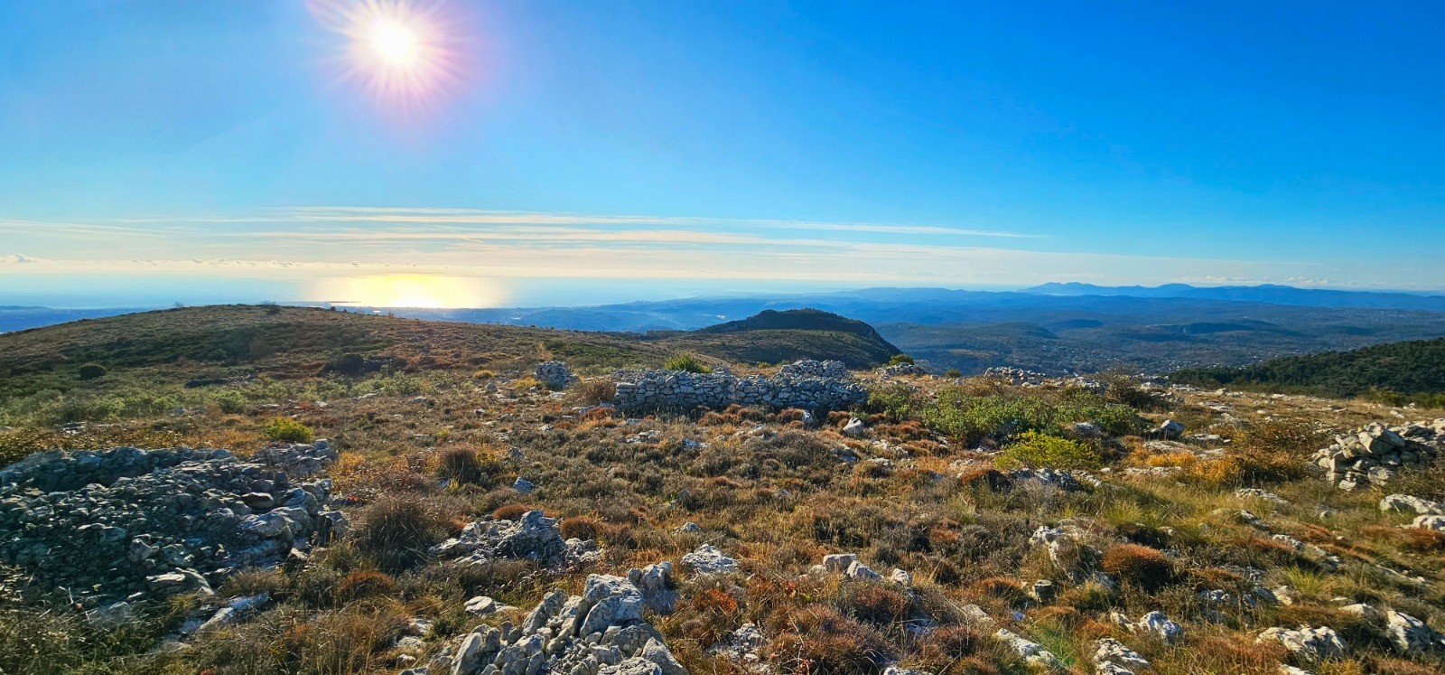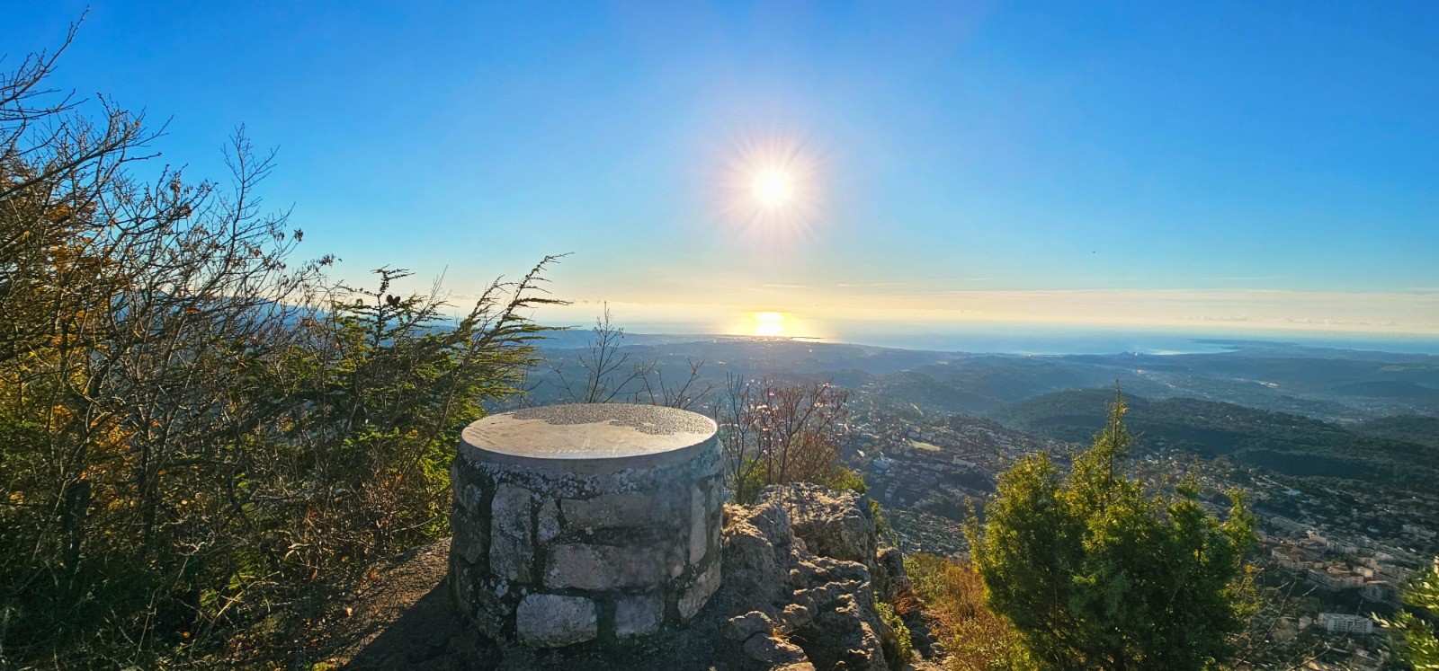 - point haut (cairn) à 809 m (au km 7,21) avec magnifique panorama sur massifs alentours (Puys de Naouri et de Tourrettes, Baou de Saint-Jeannet) + Mercantour et vue mer (photos N° 10 et 12).