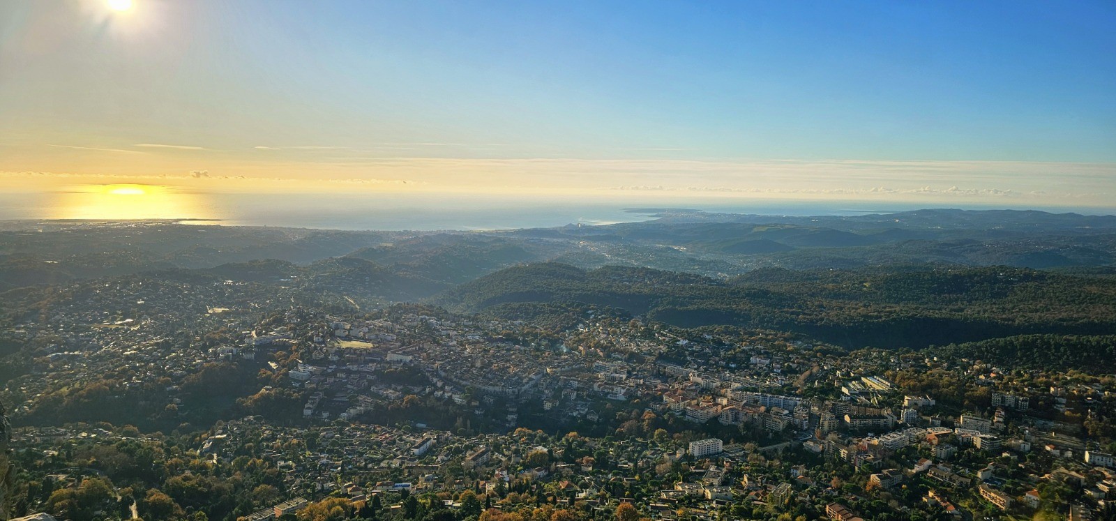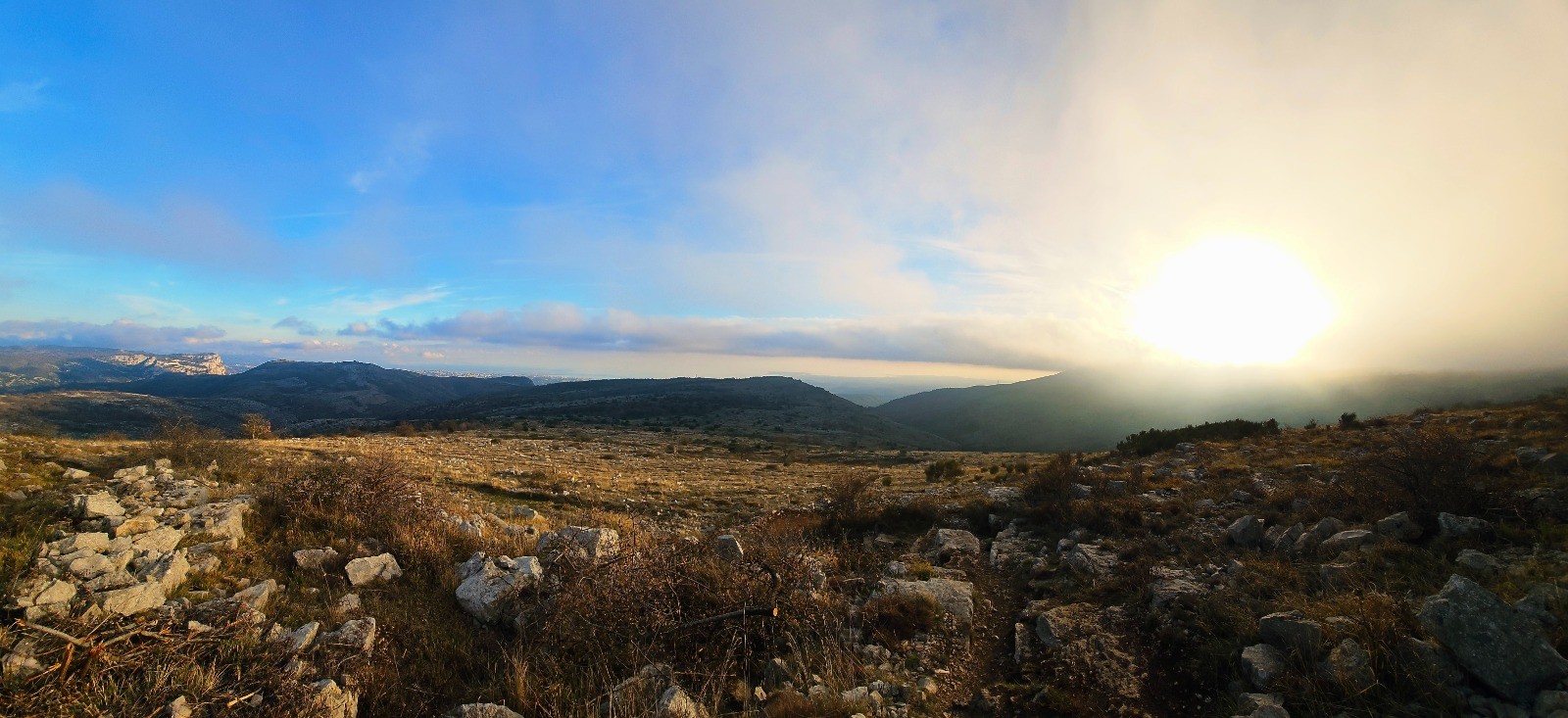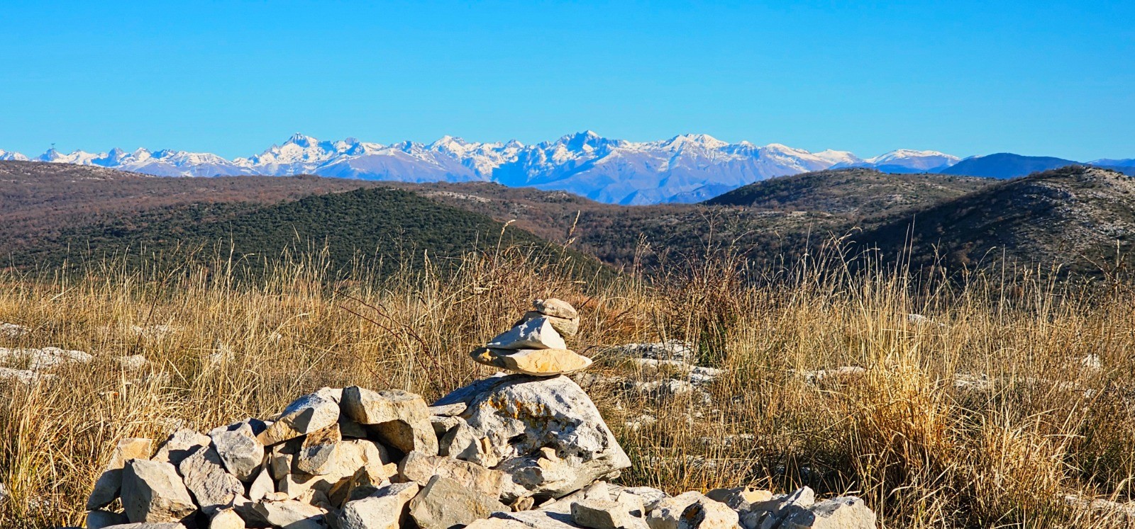 - point haut (cairn) à 809 m (au km 7,21) avec magnifique panorama sur massifs alentours (Puys de Naouri et de Tourrettes, Baou de Saint-Jeannet) + Mercantour et vue mer (photos N° 10 et 12).
