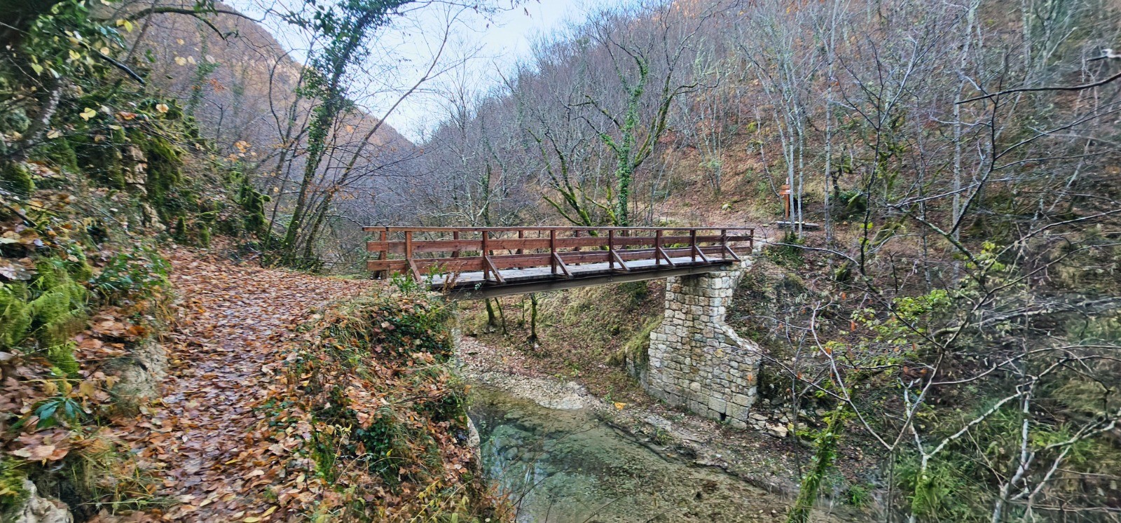 Poursuivre à droite à la B 134 en empruntant sur 2,98 km le GR 51 qui descend graduellement au vallon de la Cagne que l'on va longer jusqu'à la cascade. Franchissement de la Cagne par le pont de Vescagne (balise 129) qui permet de passer sur rive gauche avant de traverser le cours de la Cagnette (affluent) par passage aménagé, au km 14,42, peu après la Bastide de Vescagne. Suivre dès lors en A/R la rive gauche du cours d'eau par sente plus ou moins boueuse au gré des saisons, qui conduit directement à la belle cascade de Vescagne. Très belle chute d'eau avec sa vasque limpide à l'extrémité d'un vallon encaissé. Revenir sur ses pas sur 850 m pour traverser à gué la Cagne, depuis le lieu le plus adéquat situé en vis à vis d'une ancienne mine de lignite implantée sur la rive opposée. Une longue traverse métallique partiellement submergée, positionnée au milieu de la rivière et provenant de cette mine, m'a servi de point de repère pour traverser facilement de roche en roche à la date de cette sortie (Photo N° 17 - cours d'eau à l'étiage). Point d'attention sur le site d'extraction évoqué avec entrée de mine obstruée encore visible avec matériel d'exploitation à proximité. Entamer depuis ce site une longue montée continue (1,96 km avec d+ 244 m) par un bon sentier se transformant progressivement en piste, qui mène directement à la balise 143 qui fait jonction avec la route M2 du Col de Vence.