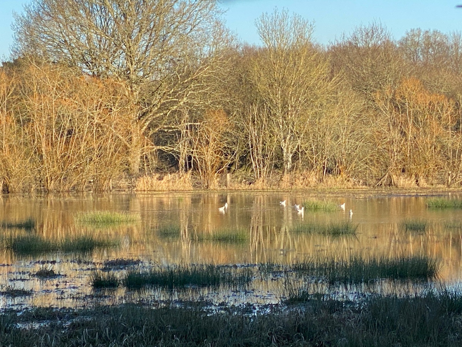 Le soleil se couche face à moi et du coup le canal ne peut nous montrer toute sa beauté. Sur l'autre rive une colonie de cygnes se repose.