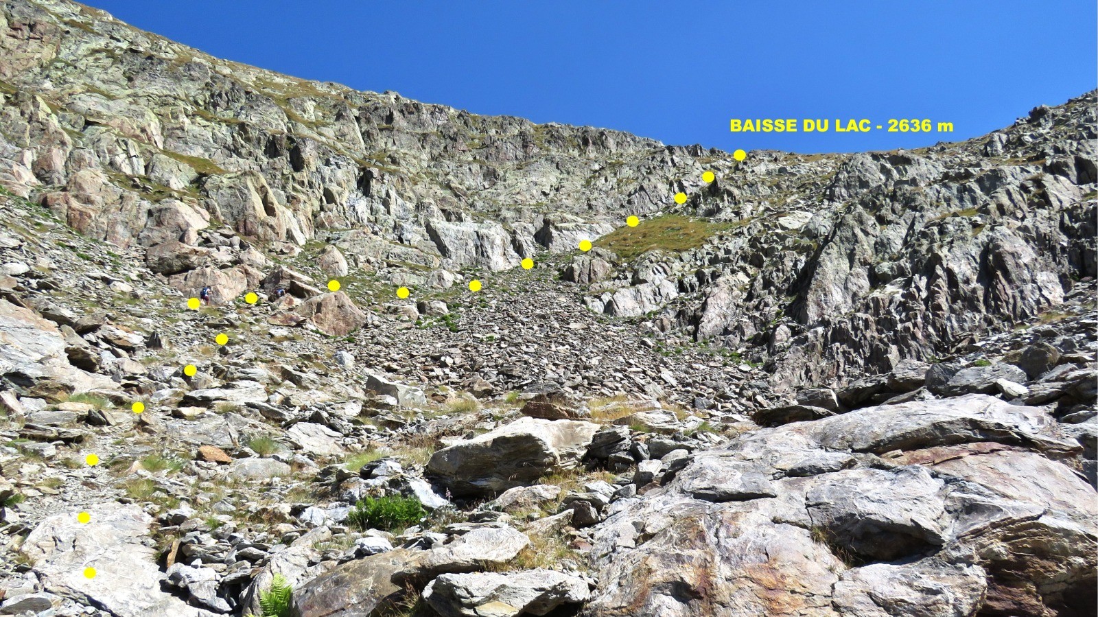 Arrivés à la Baisse du Lac, puisqu’elle a un nom maintenant, repérer, versant Guilié, un petit couloir herbeux et pierreux très pentu par lequel beaucoup de randonneurs font la boucle Combe de Guilié - Combe de Cerise : c’est plus sûr dans ce sens-là. A la descente, ce petit couloir est impressionnant !