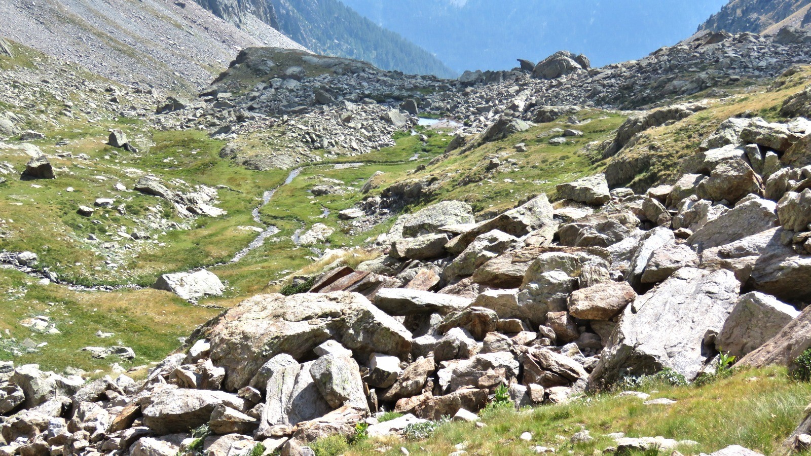 On va ensuite traverser le plus long chaos rocheux que j’ai eu à traverser mais qui est toujours facile même dans le passage des gros rochers très bien cairné. On se retrouve en plein milieu d’un paysage minéral extraordinaire pour peu qu’on se retourne régulièrement pour en faire le tour visuellement. J’ai adoré !