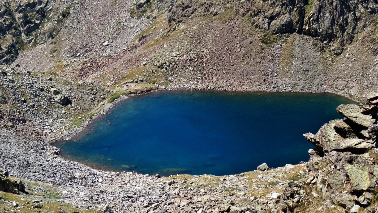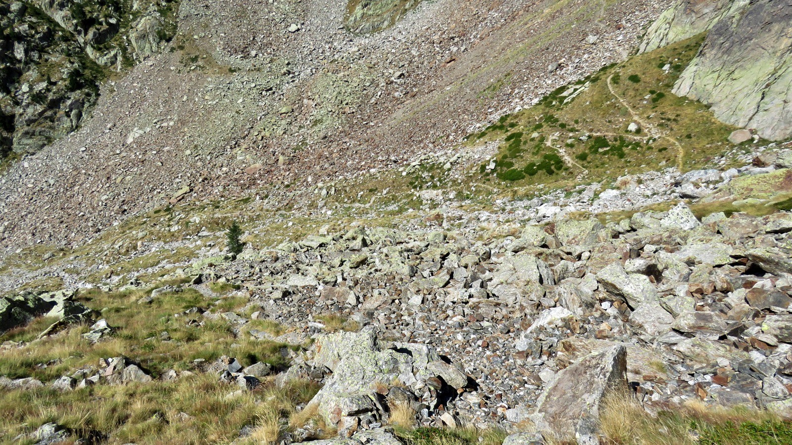 La descente va s’effectuer côté gauche des éboulis en majeure partie. Une fois passé le goulot d’étranglement en bas, on aperçoit le joli sentier qui monte au col de Guilié et qu’il est préférable d’aller rejoindre sans attendre : c’est plus confortable dans l’herbe.