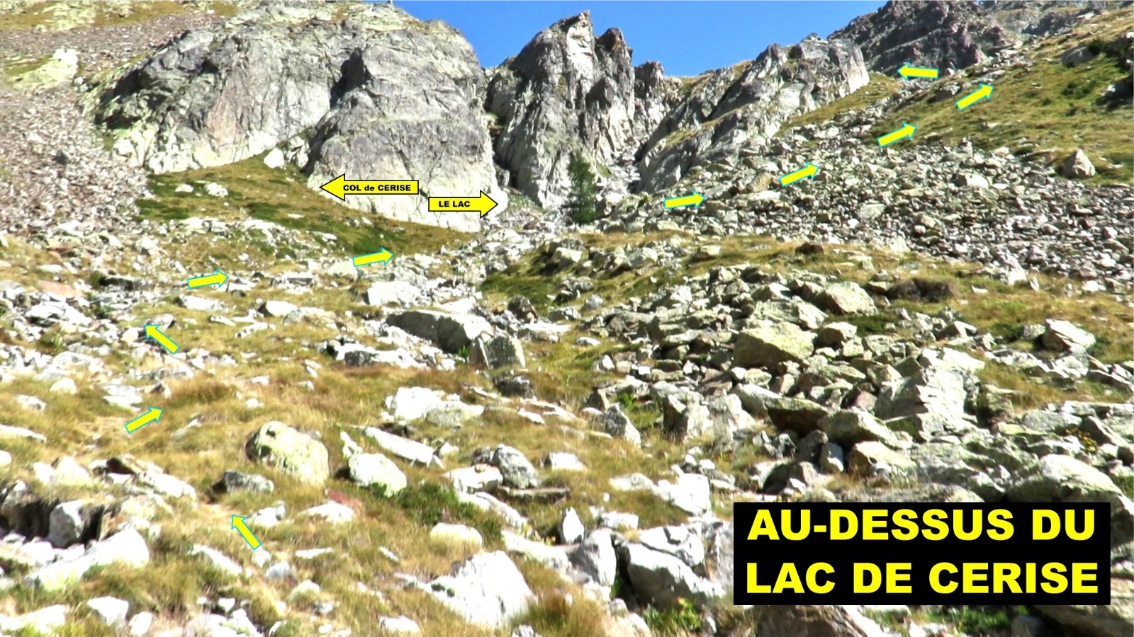 On poursuit le chemin du Col de Cerise jusqu’à arriver sous un gros rocher plutôt lisse où le chemin vers Cerise marque un lacet au coin duquel il faut prendre à droite un sentier relativement bien marqué et cairné qui contourne les gros rochers par la droite.