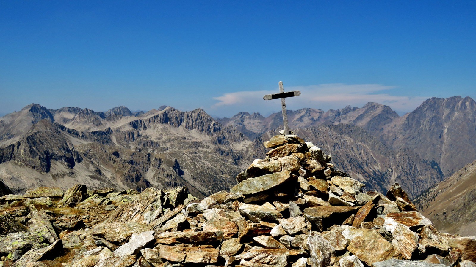 Et nous voilà au sommet, méchamment venteux ce jour-là, d’où le paysage, tous azimuts, est époustouflant. Un pied dans les Alpes Maritimes, l'altro piede nelle Alpi Marittime.