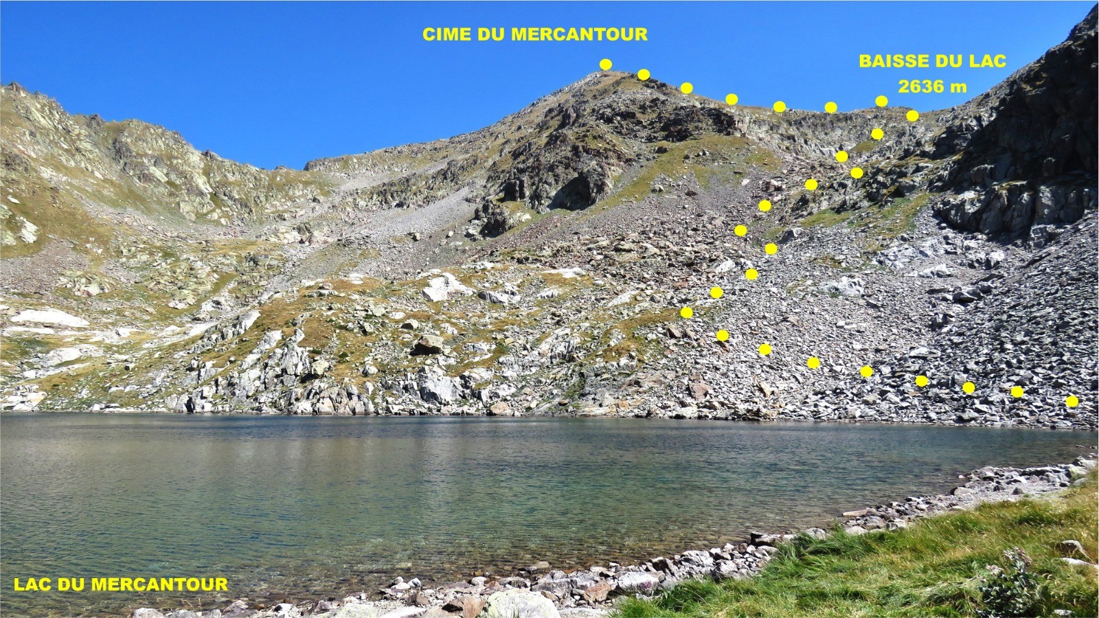 Pour résumer, si la face Nord de la Cime du Mercantour vous rebute, chargez plutôt une trace qui monte par le Vallon des Erps et la Baisse du Lac, TRÈS PENTUE, (point IGN 2636) puis redescendez par le chemin de Cerise : c’est la boucle la moins dangereuse.
