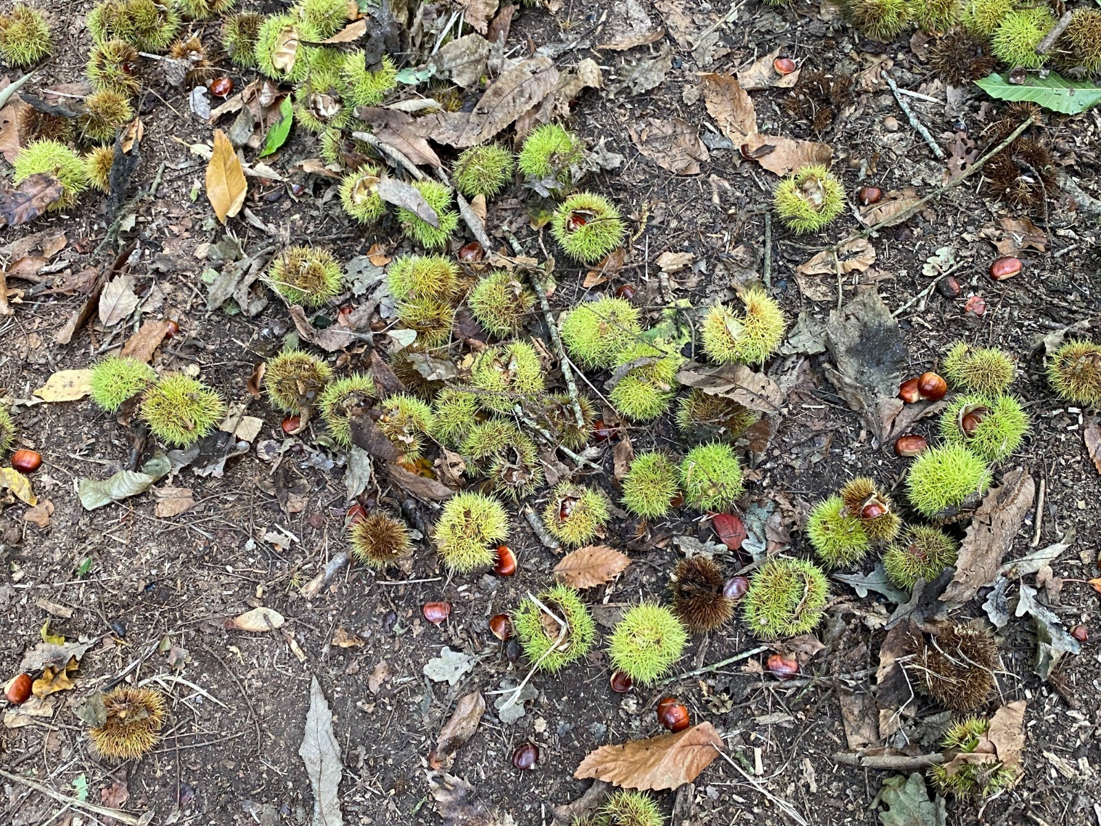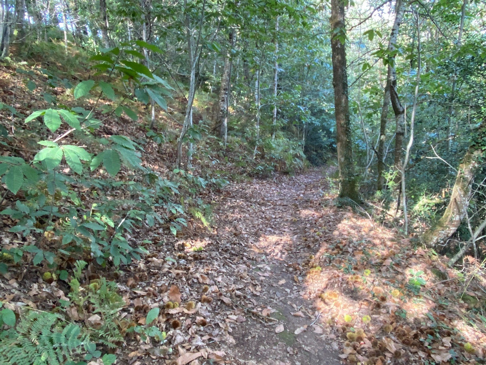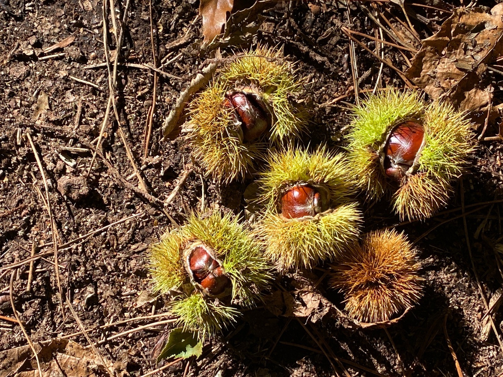 L'automne est bien avancé et nous marchons sur un tapis de feuilles de châtaignier qui craquent doucement sous les pas, comme si la forêt déroulait un chemin moelleux et parfumé.