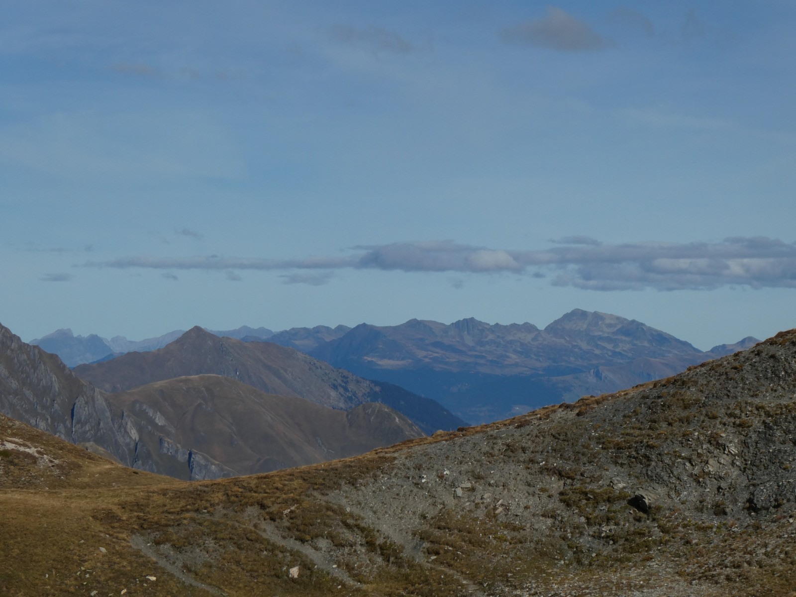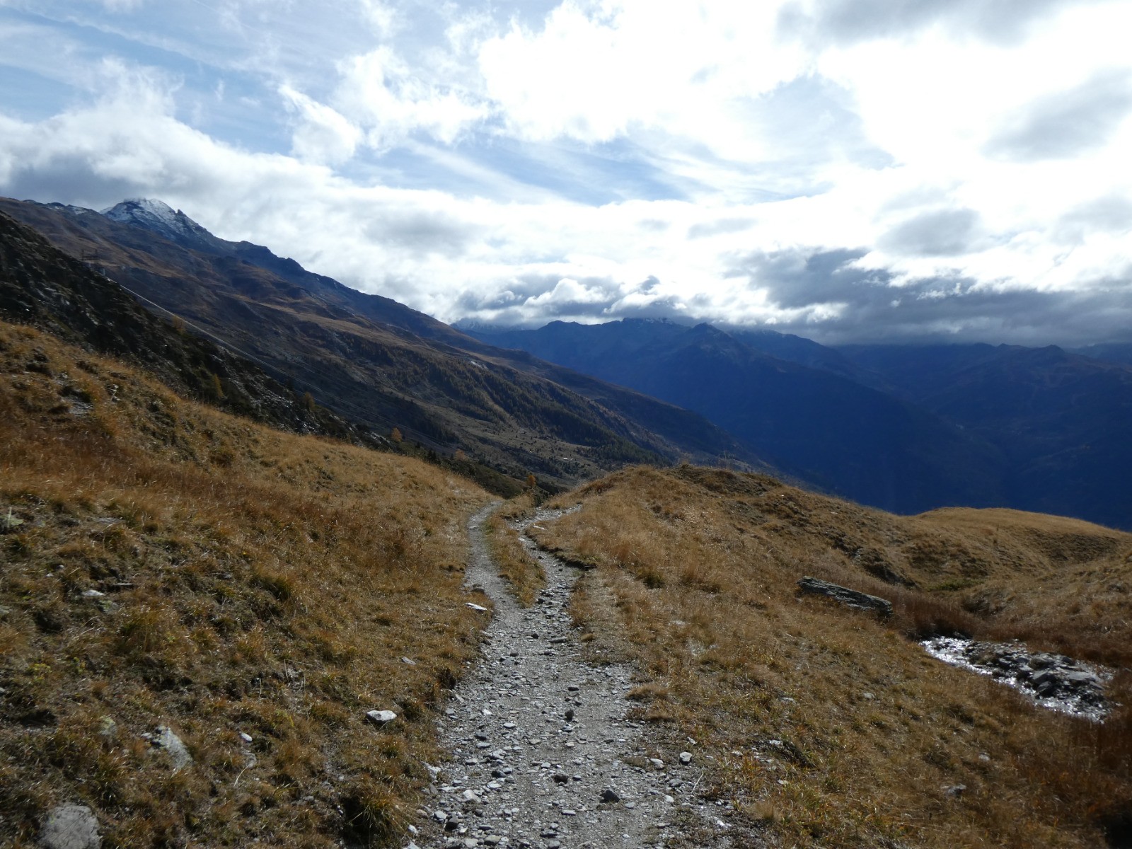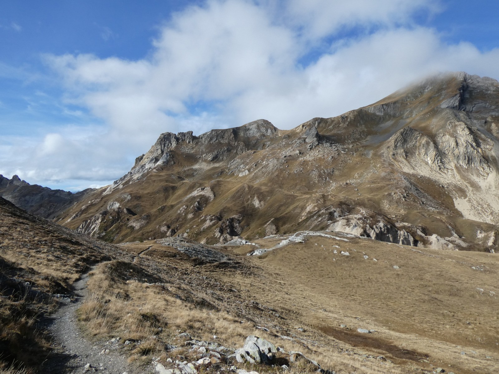 - Du col, descendre le sentier versant S droit dans la pente. Sentier raide, étroite et raviné, quelques virages ou épingles courtes.