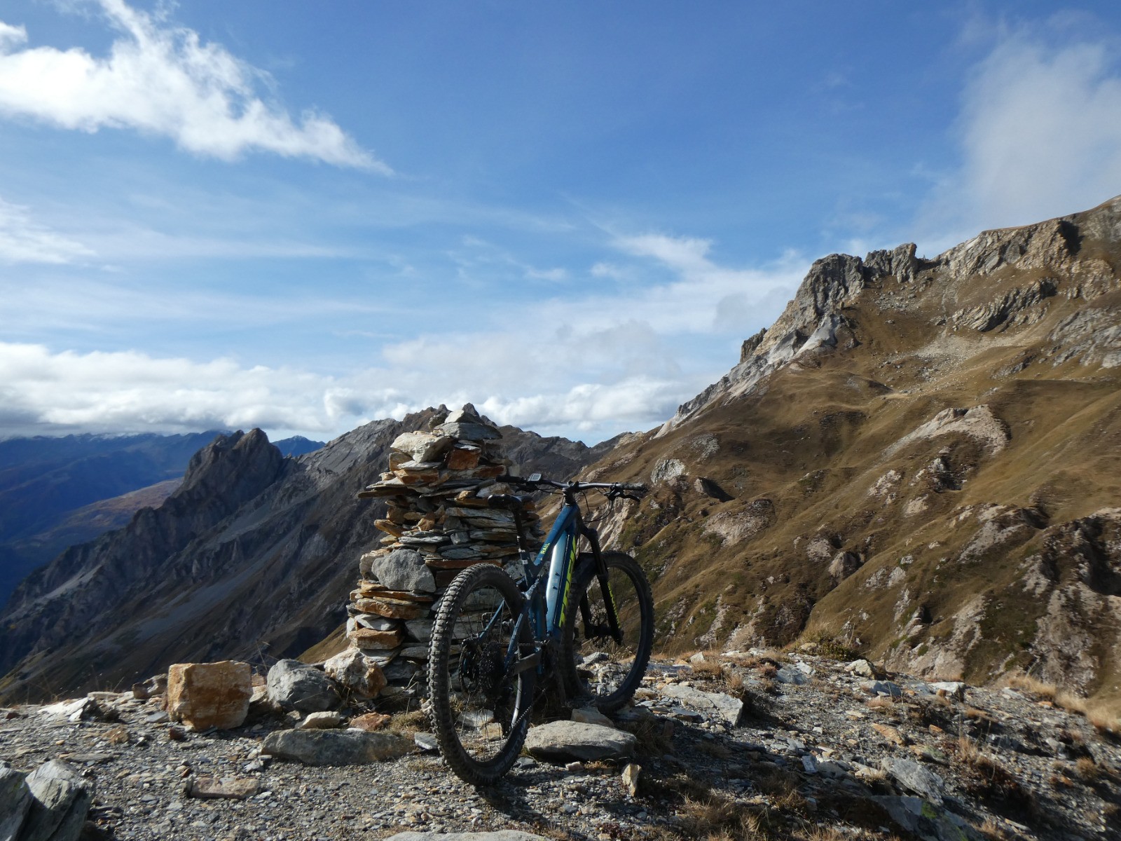 - Prendre ce sentier parfois étroit mais bien roulant, légèrement montant puis descendant jusqu'à un grand Cairn (2417m) qui surplombe le col.