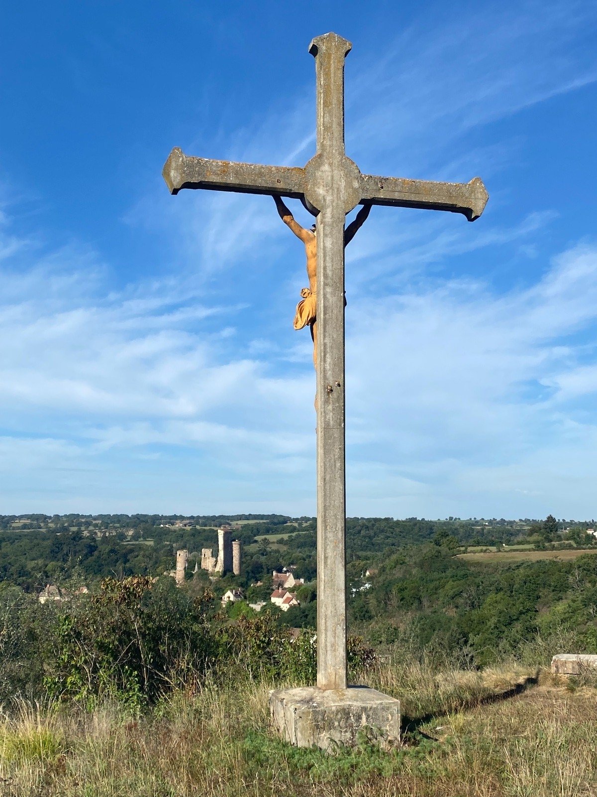 En longeant en surplomb l'Aumance nous voilà au bout d'un kilomètre au pied de la croix de l'Ours. ( photo no 2 )