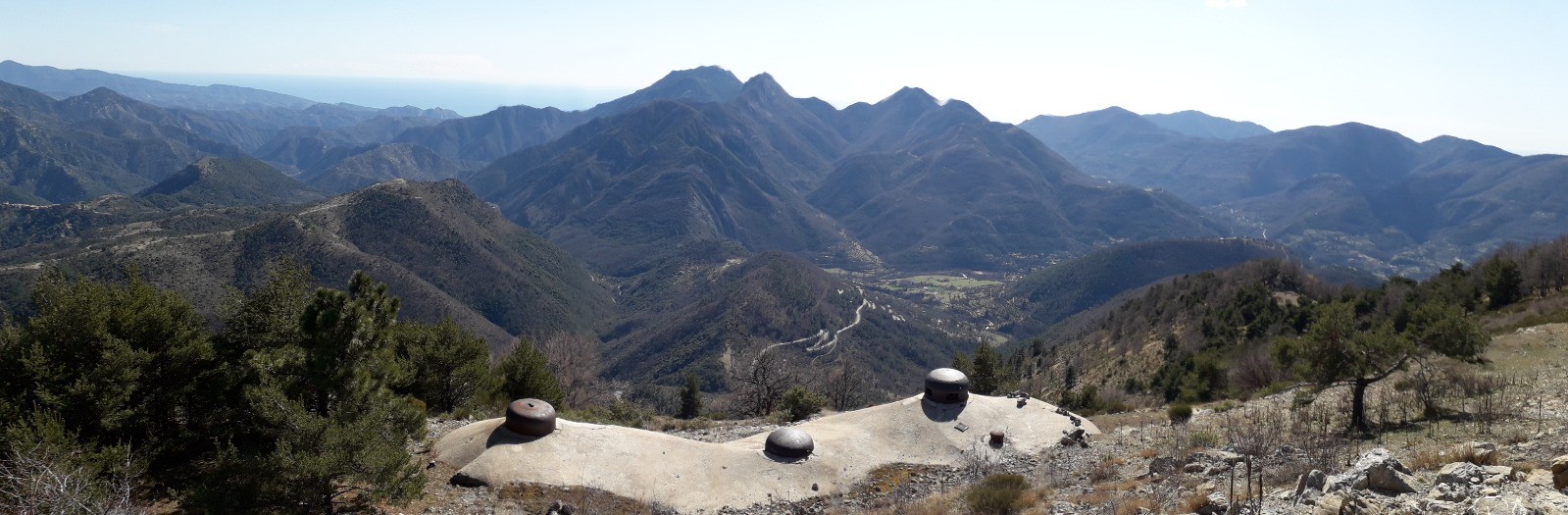 Parcours réalisé le 07/03/20. Longue rando depuis Sospel et son pont à péage du XIII ème siècle. Pour les amateurs d'histoire qui seront comblés avec les nombreux blockhaus et vestiges de la ligne Maginot jalonnant les sommets du Mont Gros et du Mont Agaisen. L'intérieur des casemates n'est pas accessible à l'exception du B1 du champ de tir d'Agaisen dont la lourde porte non verrouillée donne sur de longues galeries souterraines. J'ai parcouru l'ensemble de l'itinéraire en cette saison en m'accordant le temps de découverte nécessaire pour chaque casemate indiquée par une balise sur la trace du circuit. Une petite difficulté ponctuelle pour un passage à gué non aménagé à la balise 84 (au Km 15,23) pour un cours d'eau que l'on peut franchir avec un peu d'astuce et d'ingéniosité. Le circuit longe les limites du Parc National du Mercantour sur sa partie nord, hors les limites d'interdiction pour un animal de compagnie et on peut donc emmener un chien avec soi. Une partie du Ch. d'accès jusqu'au Mont Gros s'effectue par une longue piste militaire désaffectée depuis la Baisse de Fighièra. Précisons que l'ouvrage d'Aigaisen est véritablement remarquable puisqu'il a participé à la bataille des Alpes de Juin 1940. C'est un monument historique protégé géré par une association qui organise des visites durant l'été. Voir site Web. C'est un superbe ouvrage d'artillerie qui comprend d'immenses galeries souterraines reliant les blocs de combat avec tourelles à éclipse en surface sur toute la ligne de crête. La dernière photo baignée par les rayons du soleil couchant est celle de l'entrée de l'ouvrage qui a été édifiée à contre-pente pour la soustraire à des tirs directs. L'accès des troupes s'effectuait par la passerelle individuelle et le pont levis était conçu pour l'entrée de véhicules (camionnettes C4) assurant les livraisons/ravitaillement. Je suis impatient de pouvoir le visiter prochainement dans toute sa gloire. L'autre ouvrage du Monte Grosso est de conception similaire mais c'était le plus puissant des Alpes et il comprend 7 blocs. Son entrée est visible sur la photo N° 8 . J'espère également qu'il sera permis de le visiter. Bonne rando à tous.