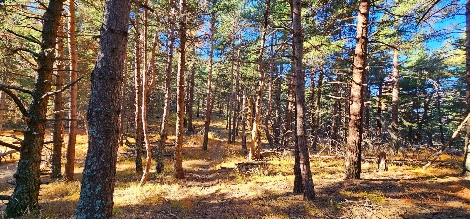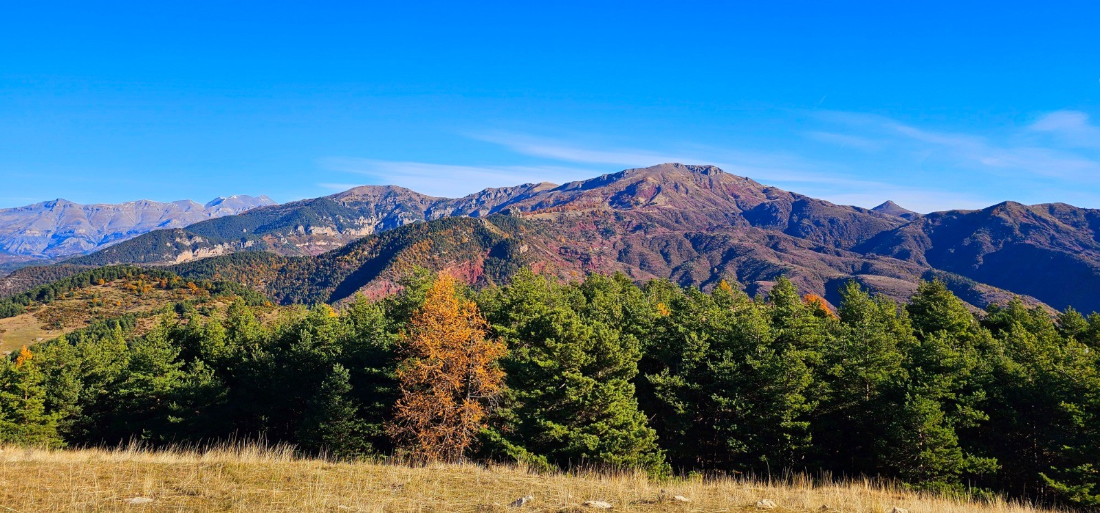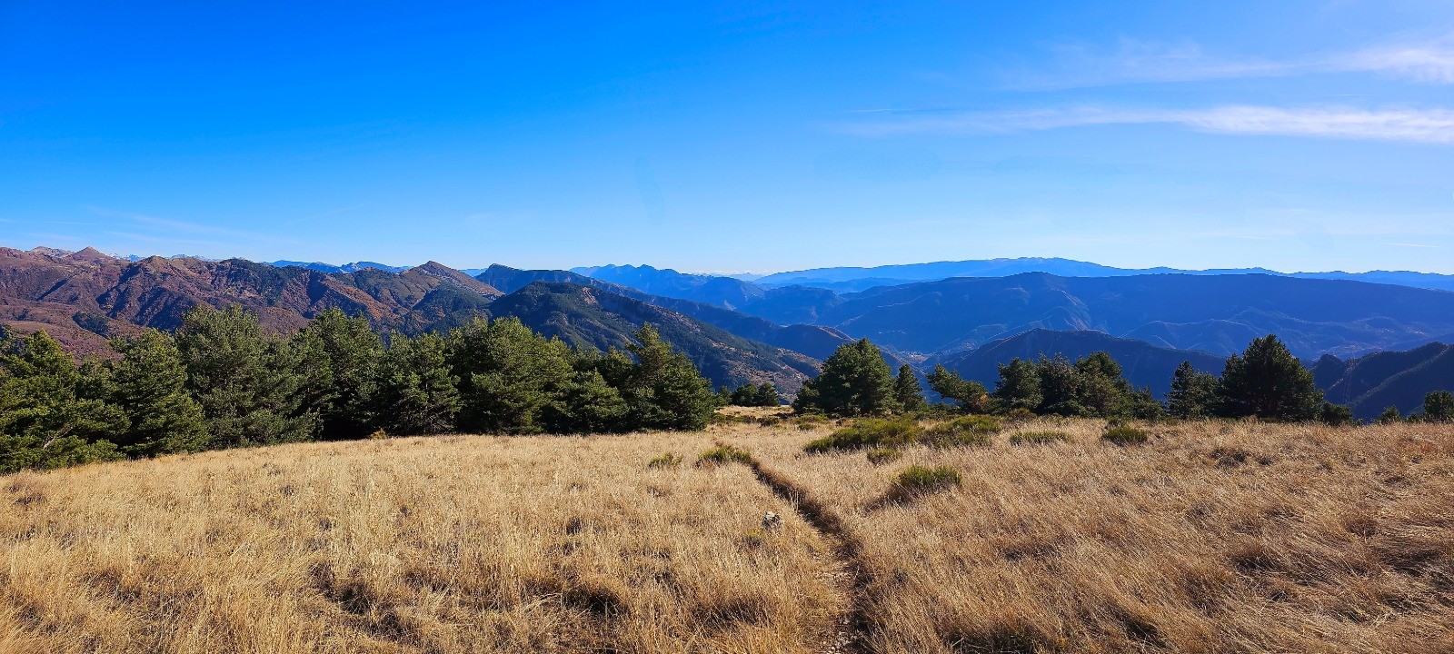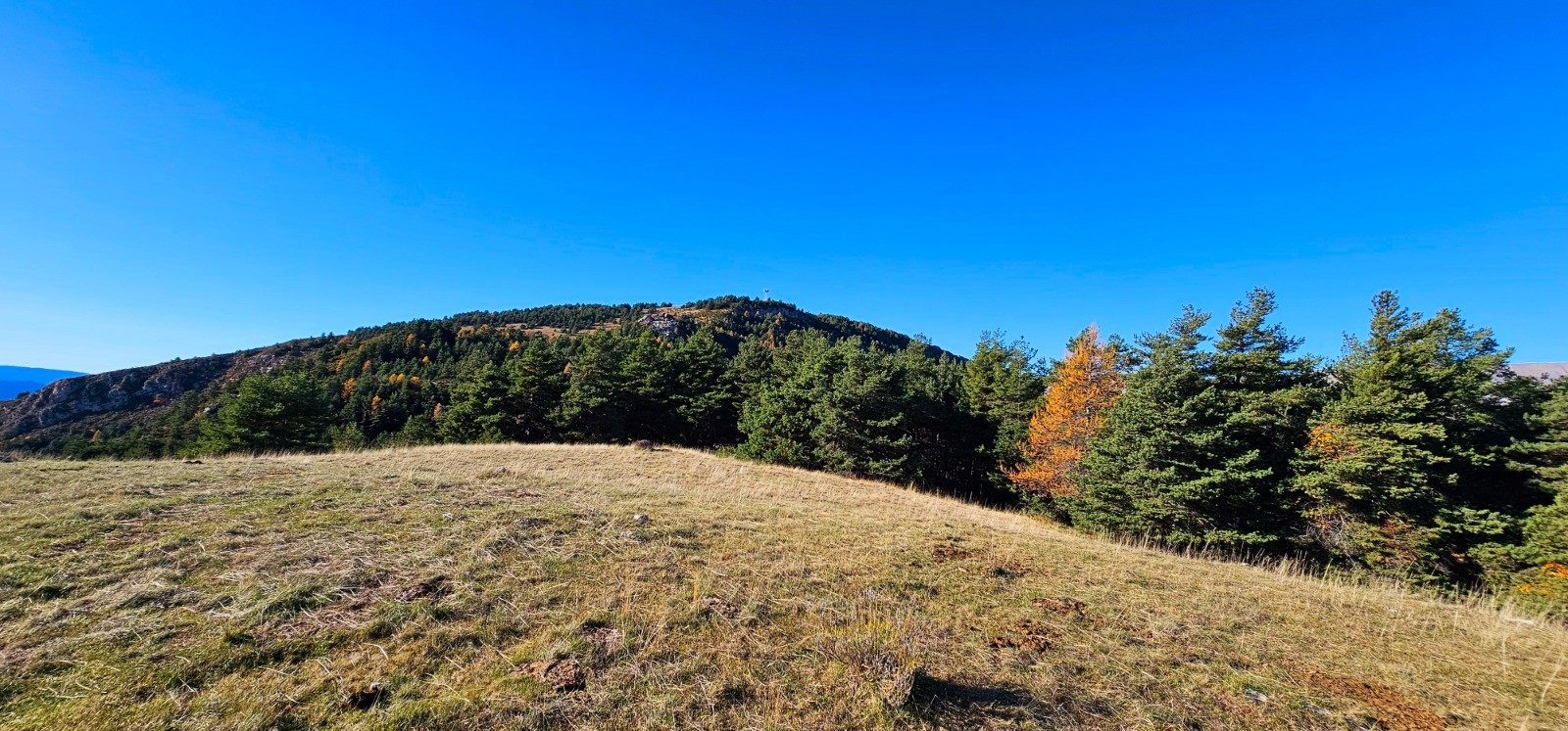 Précisons par ailleurs que la portion entre ce col et la Tête de Pibossan est la seule partie du circuit non balisée (2,10 km pour d+ 300 m) mais qu'elle ne présente pas de difficulté particulière. Il convient de localiser une sente qui serpente à travers bois jusqu'à la côte 1473 avant de remonter vers la Tête de Pibossan, en épousant l'arête élargie des courbes de niveau. Ces 2 sommets successifs se présentent sous forme de dômes émoussés à herbe rase et l'on visualise facilement le chemin à suivre avec l'antenne relais du Pibossan qui sert de repère. Panorama à perte de vue sur des reliefs moutonneux avec 2 sommets caractéristiques relativement proches, le dôme du Barrot et ses roches rouges au nord-est et le mont Saint-Honorat au nord-ouest.