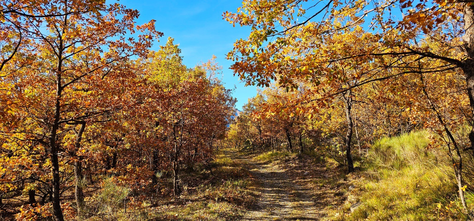 J'ai emprunté une belle piste depuis la balise 247 en traversant une magnifique forêt de chênes verts en deçà de la crête de la Faye mais il est possible de suivre cette crête par un chemin plus escarpé à partir de la balise 249 (église du village de St-Léger).