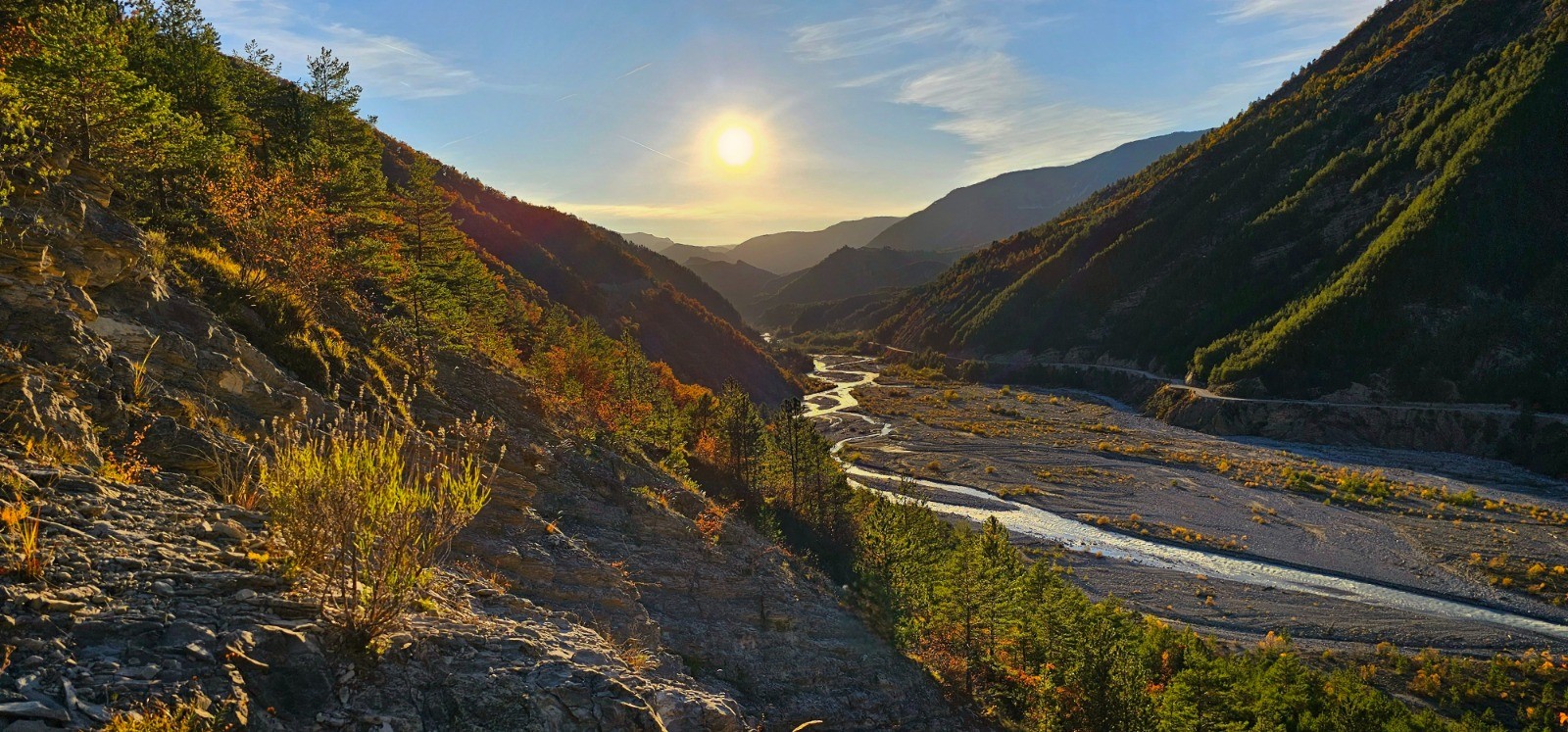 Ces 2 chemins se rejoignent à la balise 102 avec un superbe point de vue sur le vallon et le fleuve du Var en contrebas. Le chemin bifurque et descend plein nord par de multiples lacets sur la partie ombragée du bois de la Faye avant de parvenir aux balises 101 et 100 délimitant le pont à arche unique franchissant le Var et débouchant sur la D 2202. Retour au parking en suivant cet axe routier sur 1,68 km.