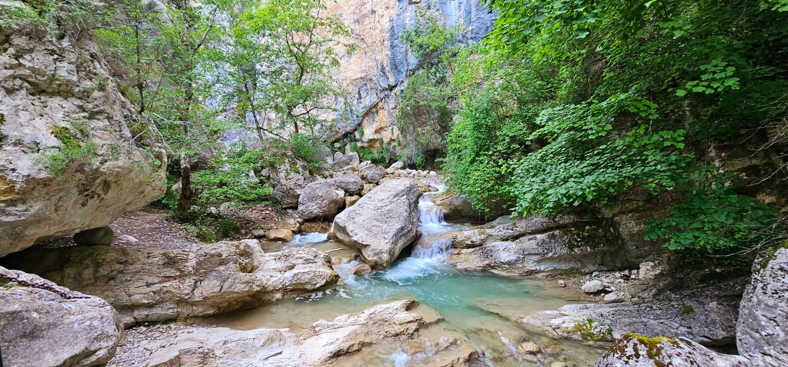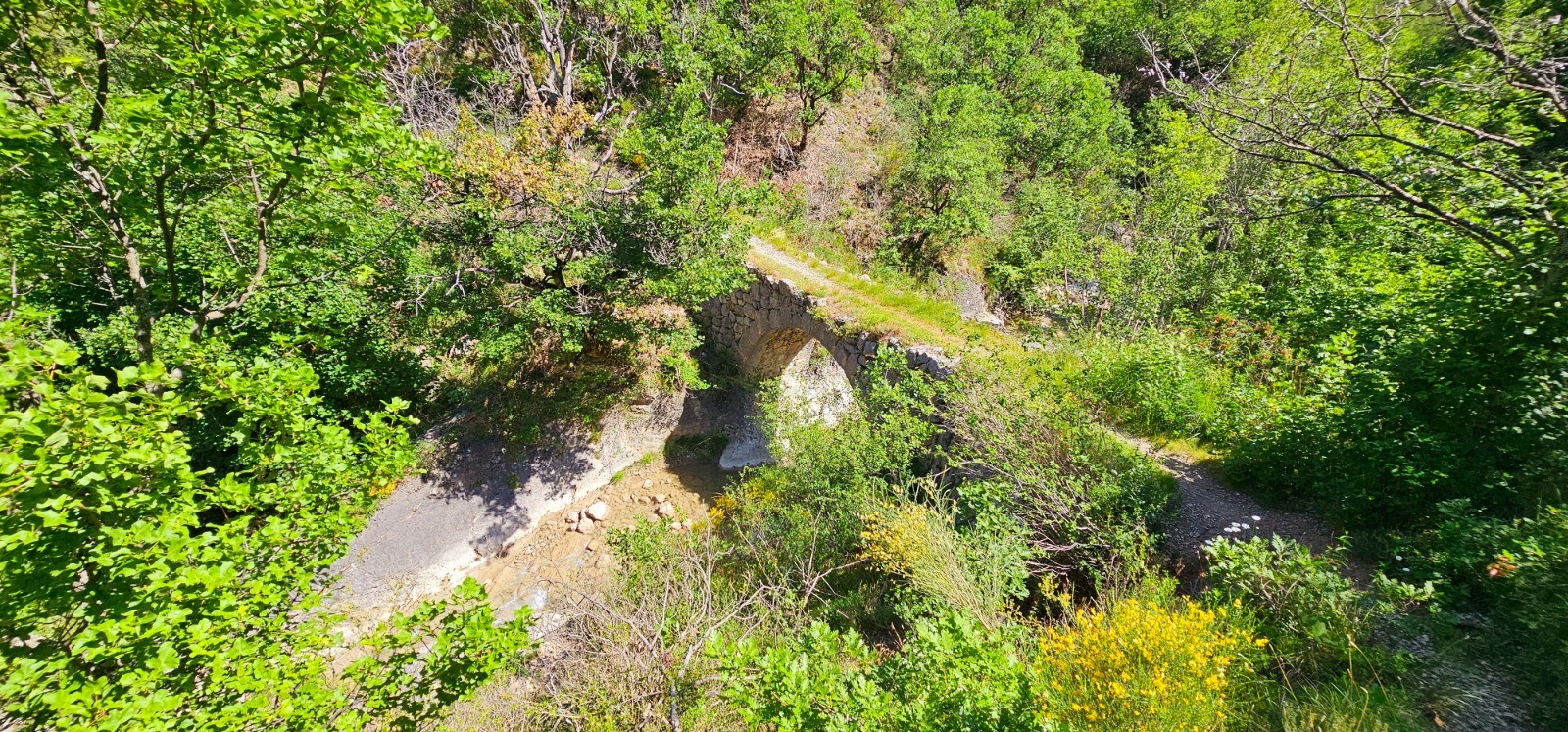 Départ depuis les abords du parking dit "de l'Estoublaïsse" en bordure de la D 667, accessible depuis le village d'Estoublon dans la vallée de l'Asse. Il est utile de signaler que ce parking figurant sur carte IGN fait désormais l'objet "d'interdiction de stationnement à tous véhicules de 22h00 à 06h00" mais nombreuses possibilités de se garer en bordure de route. La randonnée débute au point côté 606 avec un chemin barriéré (PR). Se diriger vers l'est sur 340 m et accéder à la rive gauche de l'Estoublaïsse par une passerelle avec un tableau d'orientation signalant l'entrée dans la Réserve Biologique Domaniale des Gorges de Trévans. Magnifique environnement avec cascades en longeant le torrent jusqu'au Carrefour des Gorges et poursuivre à l'Est vers le ravin du Pas d'Escale par la rive droite du Clovion où l'on quitte cet univers à prédominance aquatique pour un cheminement boisé jusqu'au Carrefour Saint-André (795 m). Première ascension sur 600 m (d+ 92 m) jusqu'aux vestiges de l'ancien monastère médiéval de Saint-André du Désert (XIII ème siècle) érigé sur un piton rocheux dominant les gorges. Reprise du parcours depuis le col de St-André par sous-bois jusqu'au pont romain et sa belle clue (km 5,76) où l'on va être confronté à une végétation moins dense dans une zone plus aride en empruntant la route de Majastres qui suit le cours du ravin du Pas d'Escale via le pont du même nom. Quitter la route à la ferme du Gros Jas et amorcer une montée plus soutenue à partir de l'étang aux Serpents jusqu'au hameau du Poil édifié sur la ligne de crête du Chastelan qui nous fait désormais évoluer dans un cadre de moyenne montagne. Superbe site où l'on ne peut s'empêcher de ressentir une certaine nostalgie au sein de cet habitat désormais délaissé qui comptait encore une centaine d'âmes au 19ème siècle. Belle fontaine sur place avec emplacements de bivouac aux abords (+ table et bancs). A noter que le gîte figurant encore sur carte est désormais fermé par mesure sanitaire. Continuer par chemin prolongeant la rue principale jusqu'au gué du km 13,49 avec de beaux emplacements propices au bivouac, échelonnés sur 600 m en bordure de cours d'eau. J'ai pris le parti de faire une halte nocturne au col du Villard situé au-delà à 1230 m (plateau herbeux) où l'on bénéficie d'un superbe panorama. Prendre ses dispositions pour s'alimenter en eau avant l'ascension.