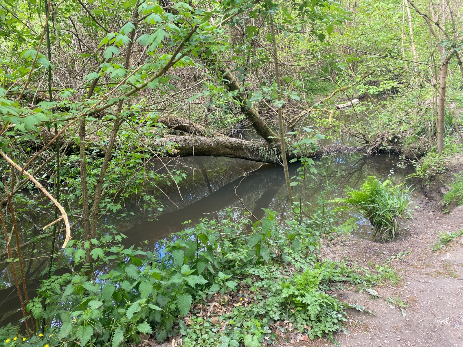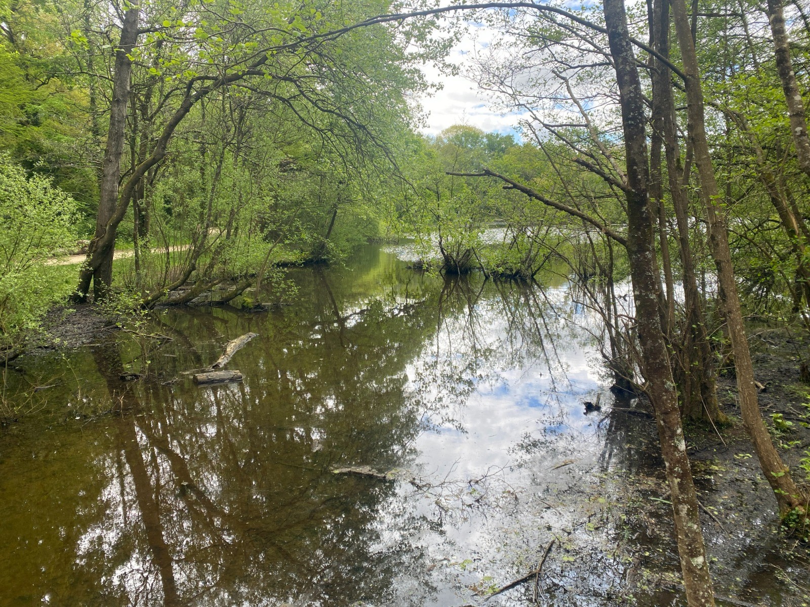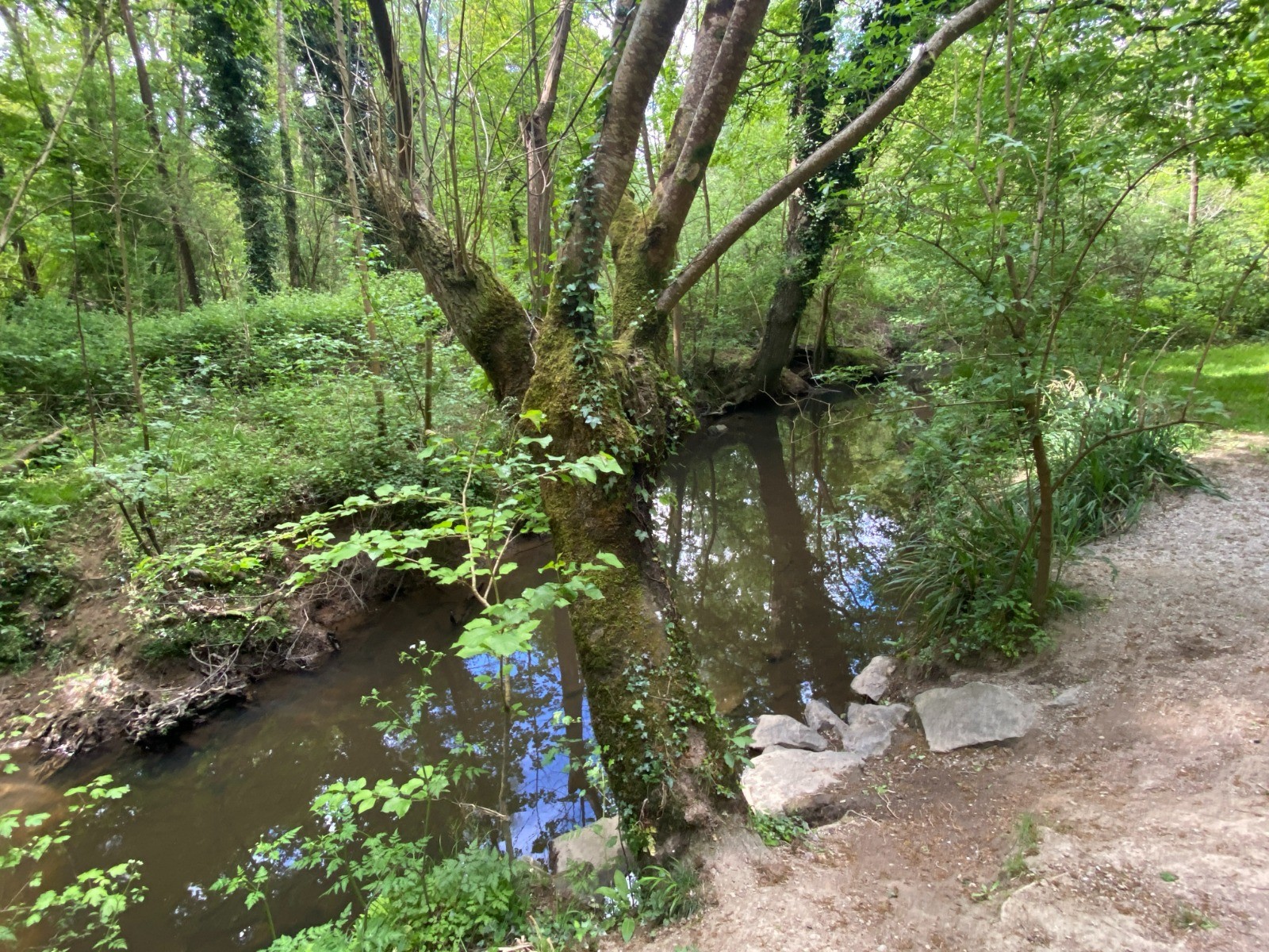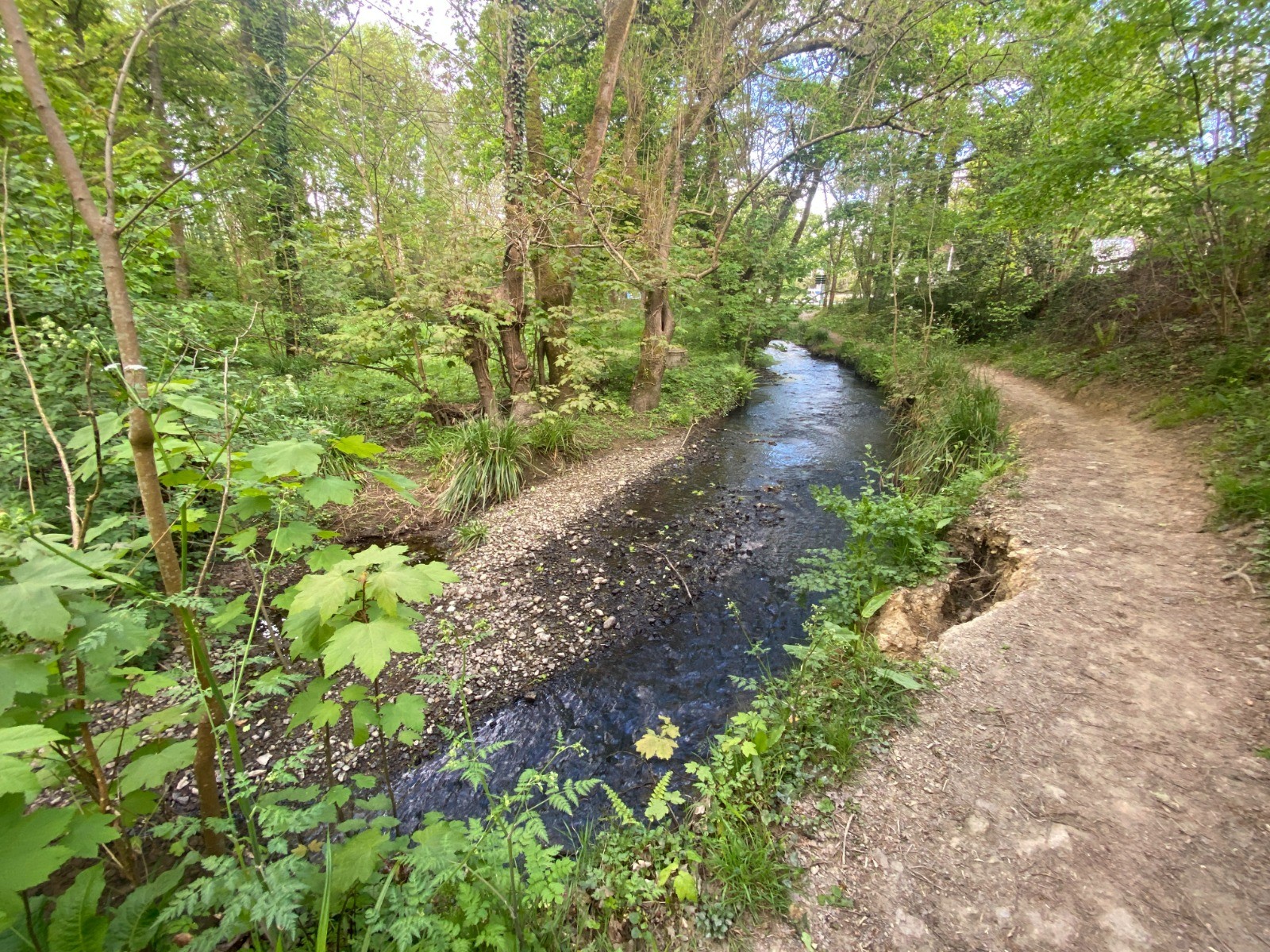 Le sentier longe la rivière dans une ambiance paisible, avec le bruit de l'eau qui accompagne la marche.