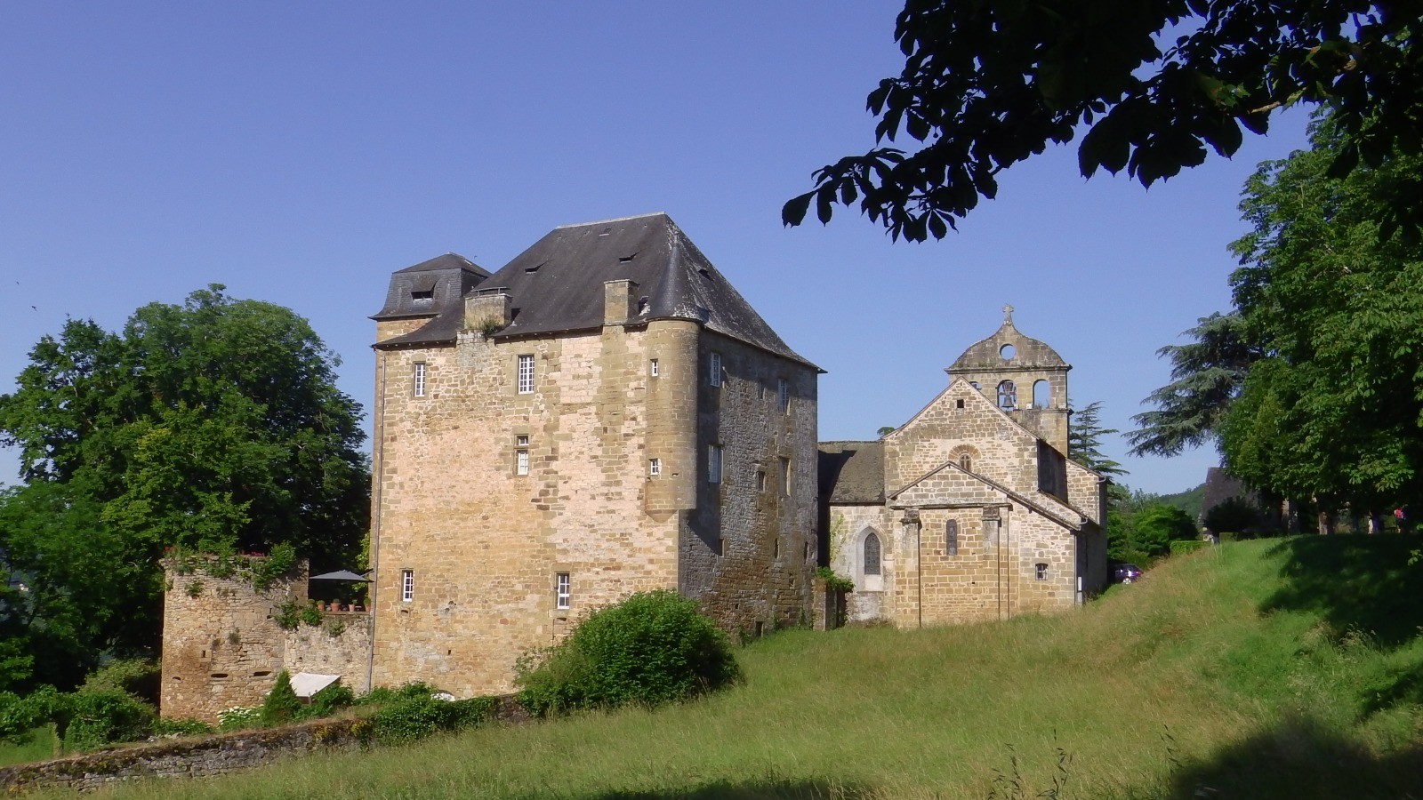 (Historique : Importance stratégique du château commandant la vallée de la Couze et ayant appartenu à la Vicomté de Turenne. Mention du château au 11e siècle, reconstruction du donjon au 13e siècle. Château vendu comme bien national en 1795. Pigeonnier recouvert d'un dôme. La morphologie des ouvertures du donjon, portes et fenêtres en arc brisé, permet de dater le donjon de l'époque gothique.