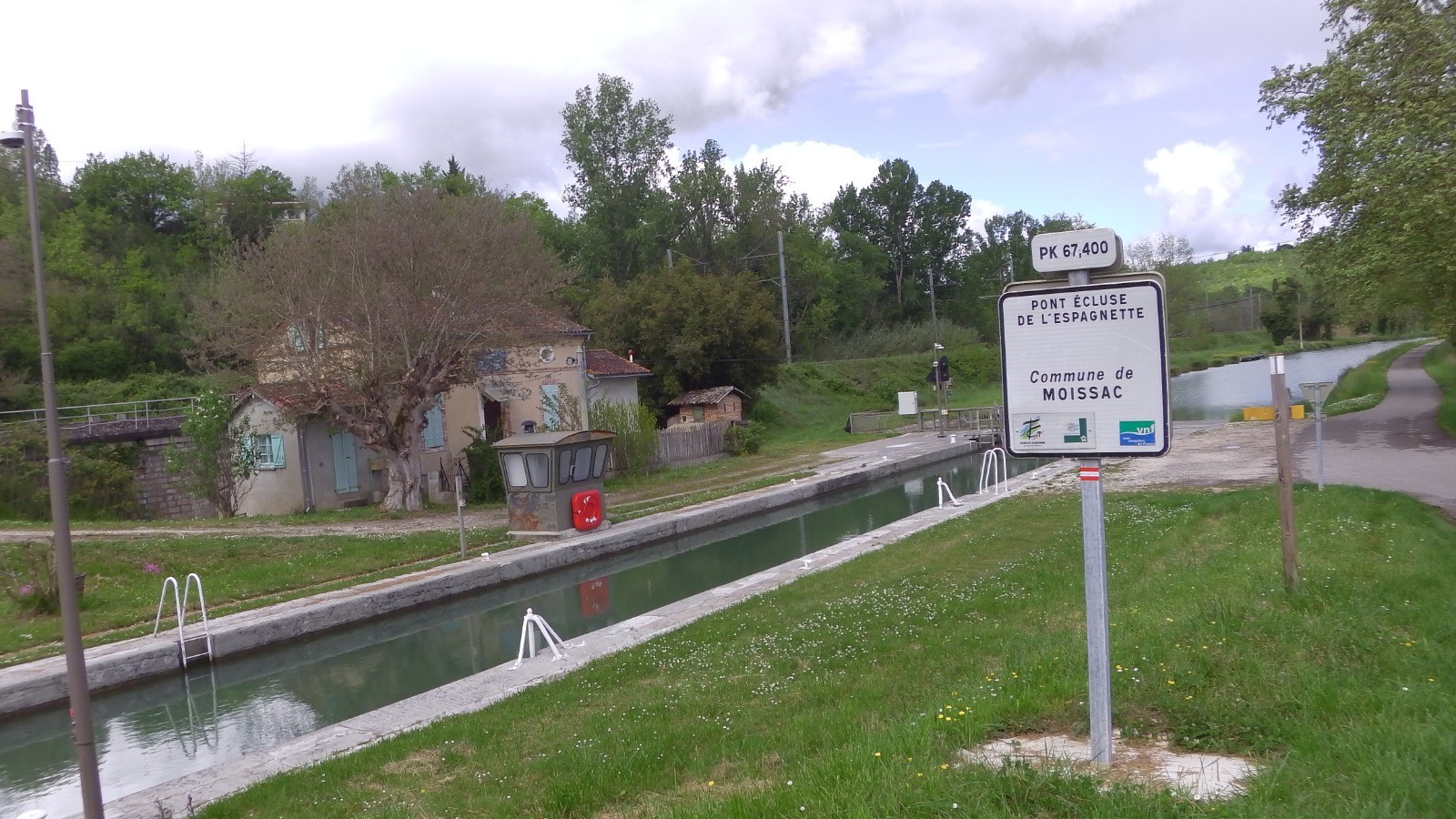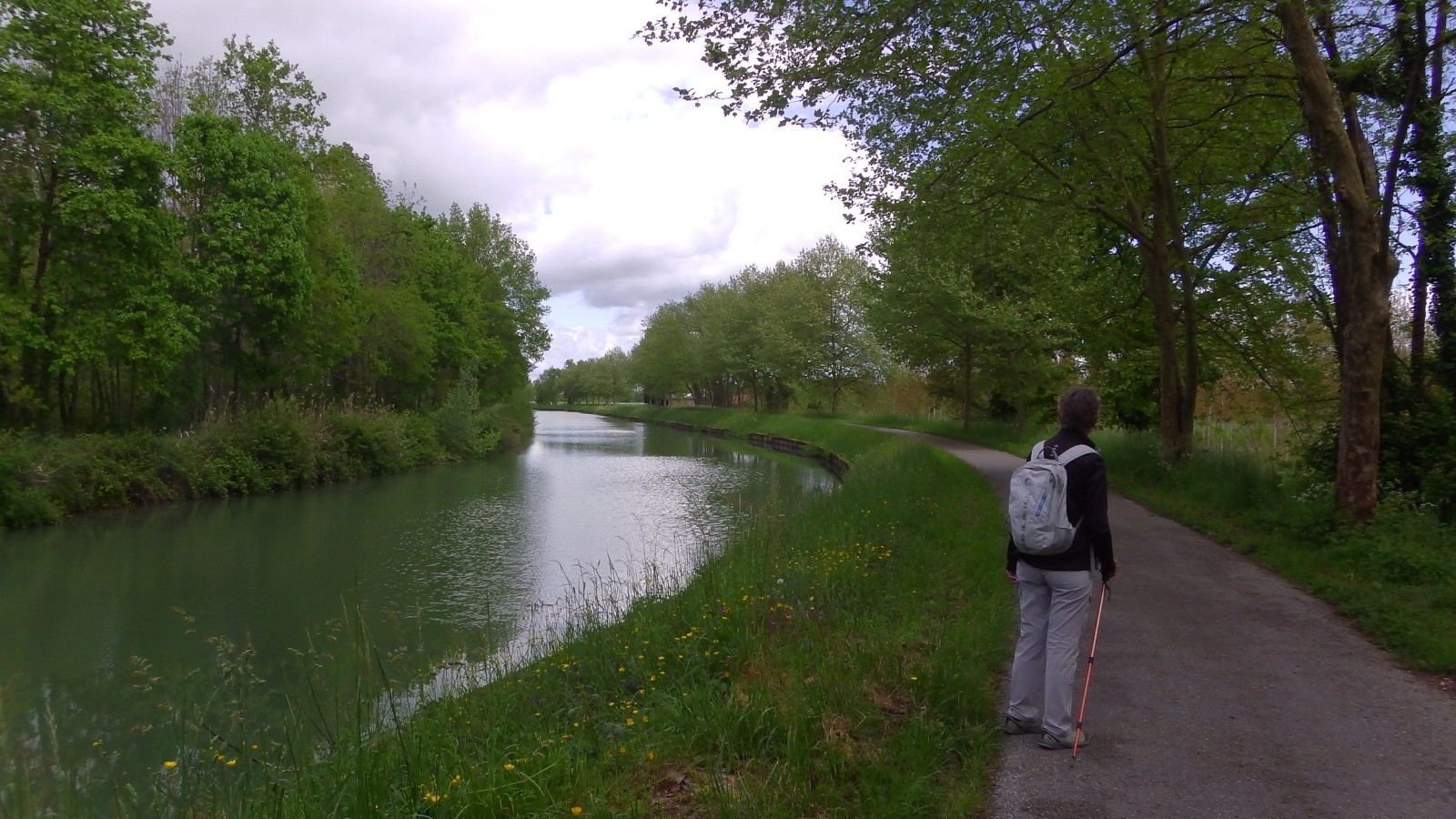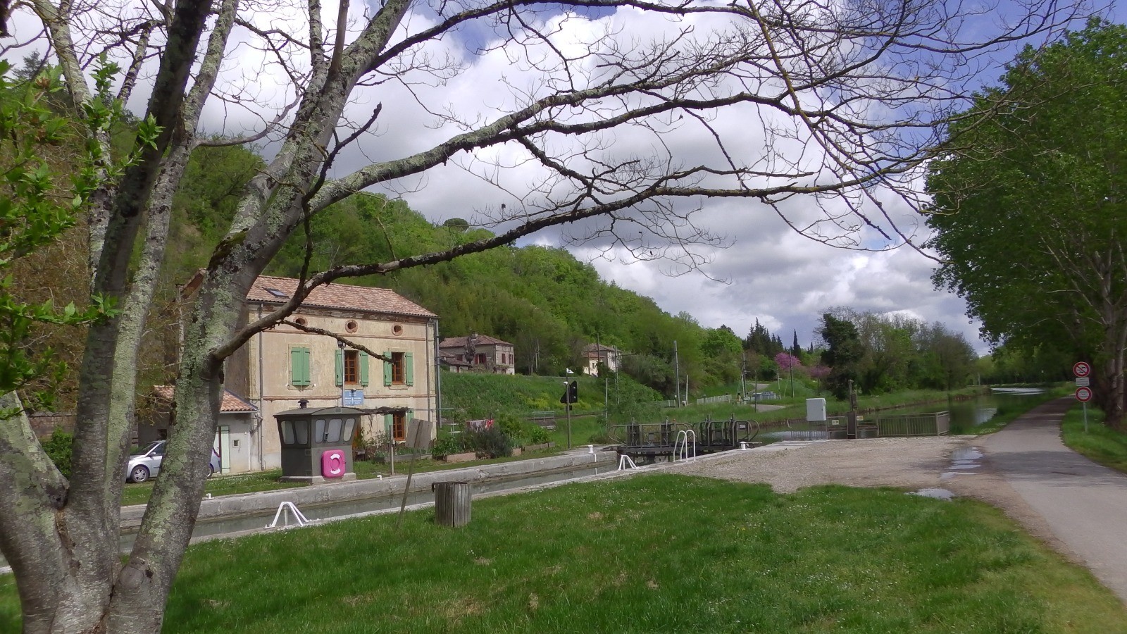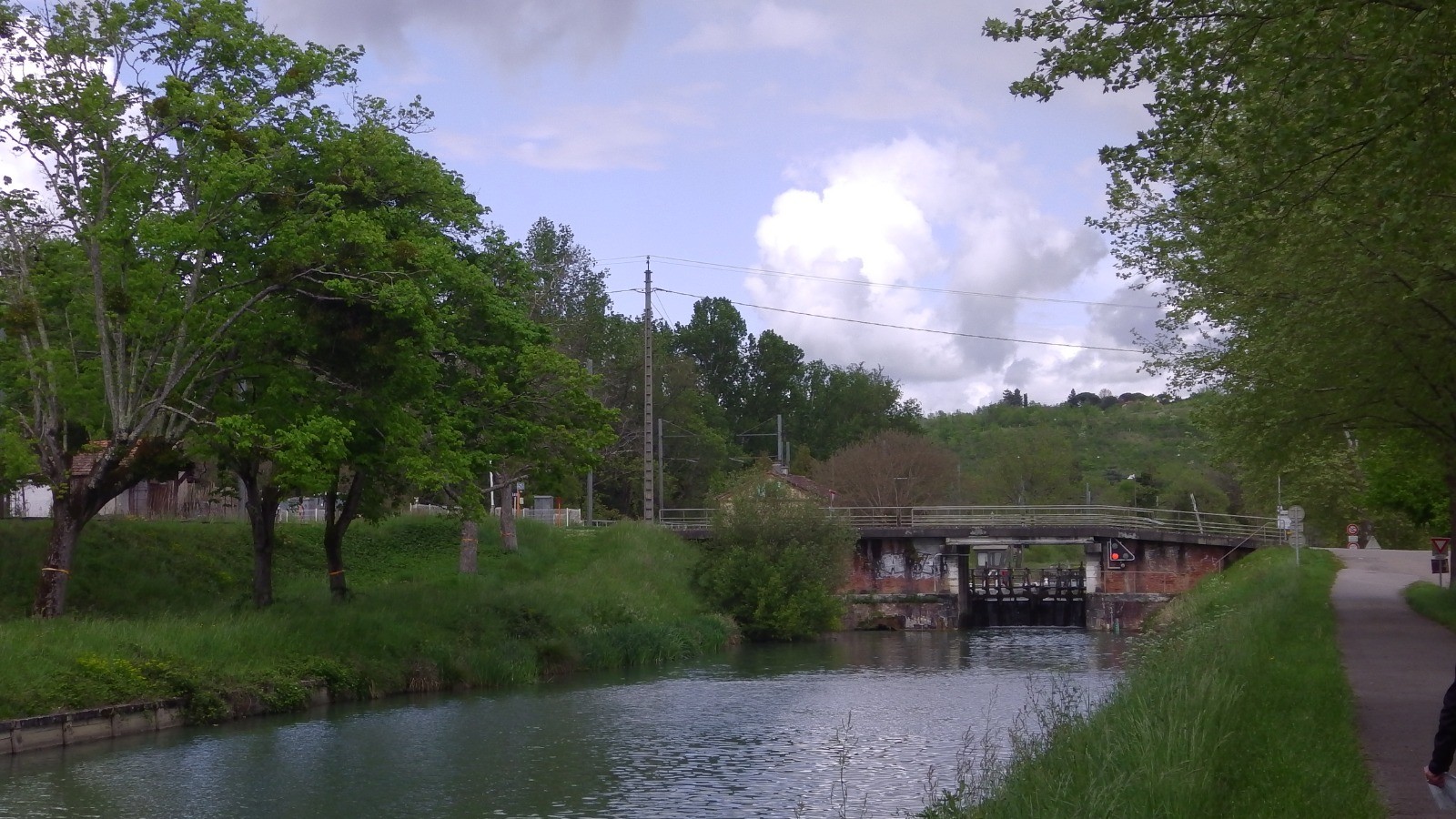 Après un passage à la table d'orientation qui domine la vallée et la base de loisir, le chemin balisé PLONGE vers la vallée et après la traversée de la route et des rails mène à une écluse. Une voie de service longe le canal, passe sous le pont qui mène à St Nicolas de la Grave et à la base nautique. Après la seconde écluse, il faut prendre la route à gauche (attention aux balisages qui se mélangent) qui monte vers La Roquette. A Pinette, à la dernière maison, un petit panneau jaune invite à descendre ... à pic le long d'une pâture où paissaient des poneys le jour de notre passage. En bas un peu de route et un chemin qui part sur la gauche pour MONTER (panneau informant que la montée est super HARD) vers Boudou.