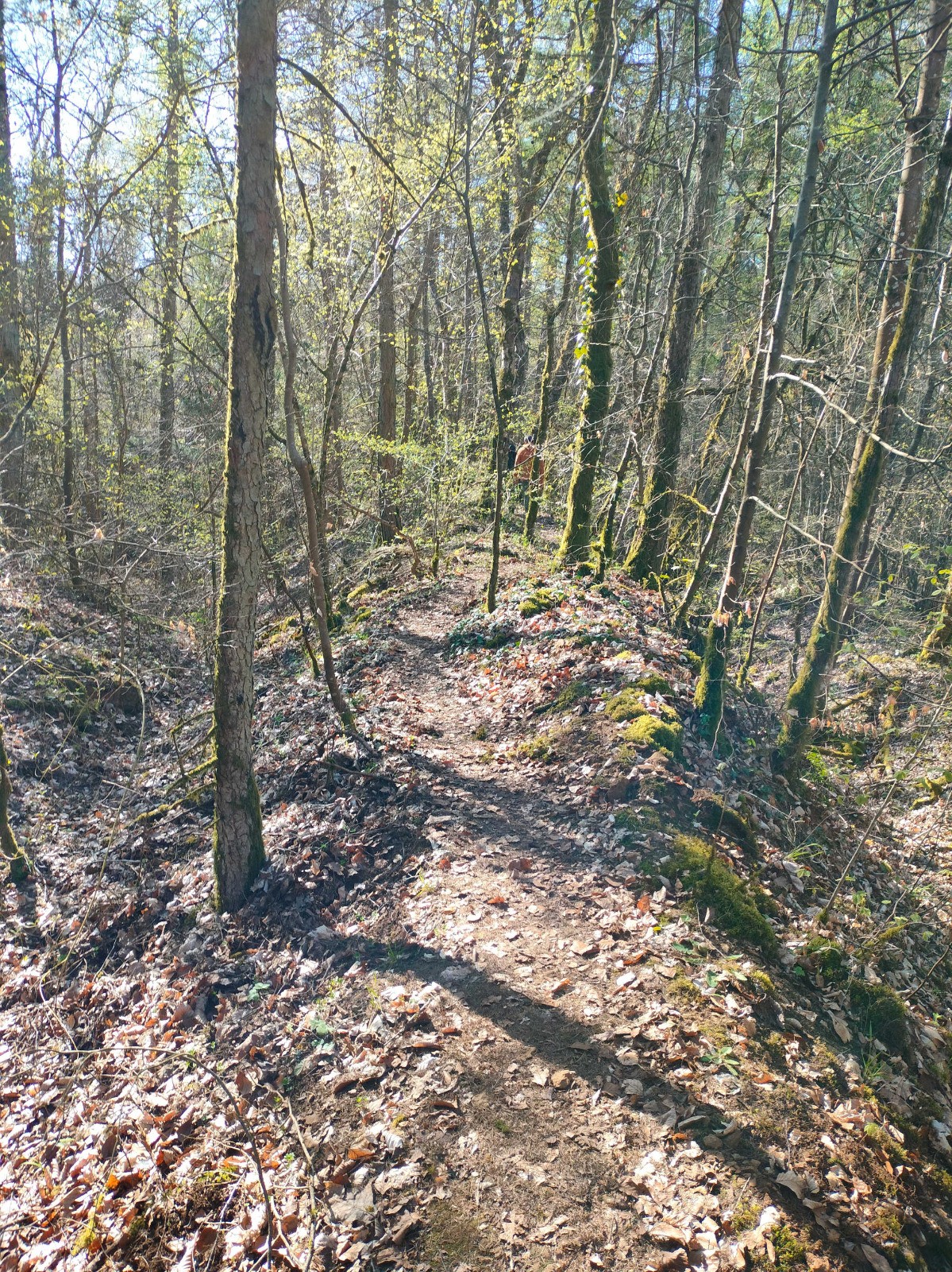 Prinzenberg. La pente s'accentue, les jambes travaillent en souplesse pour maîtriser la descente. Mais cette parenthèse plus douce est de courte durée. Il faut bientôt quitter cette vallée pour remonter dans le bois, et c'est là que la promenade se fait plus sauvage et plus technique.