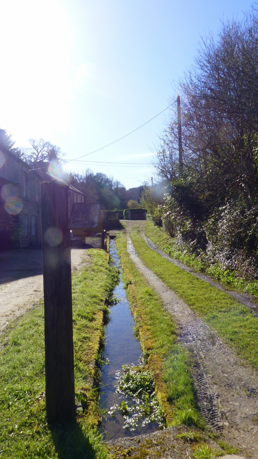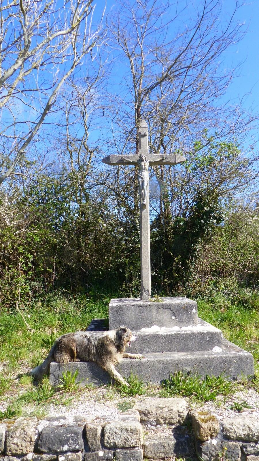 C'est après que j'ai compliqué un peu en m'écartant de l'ancienne trace. Avantage : moins de route goudronnée passante ! Inconvénient : deux trois passages un peu "scabreux" (genre : que je n'y guiderai pas un groupe d'humains et de chiens !) : jusqu'à l'église du Vicel, ça va car nous n'empruntons pas de route passante et restons à flanc de colline sur des chemins praticables. Les ennuis commencent à la fontaine au Mercier, au km 12,4 (j'ai failli ne pas voir le chemin qui était "masqué" par des broussailles (volontairement laissées là mais dans une bonne ou une mauvaise intention ? Qui lo saï ?). Après les broussailles, de la boue, des ornières et des arbustes tombés !