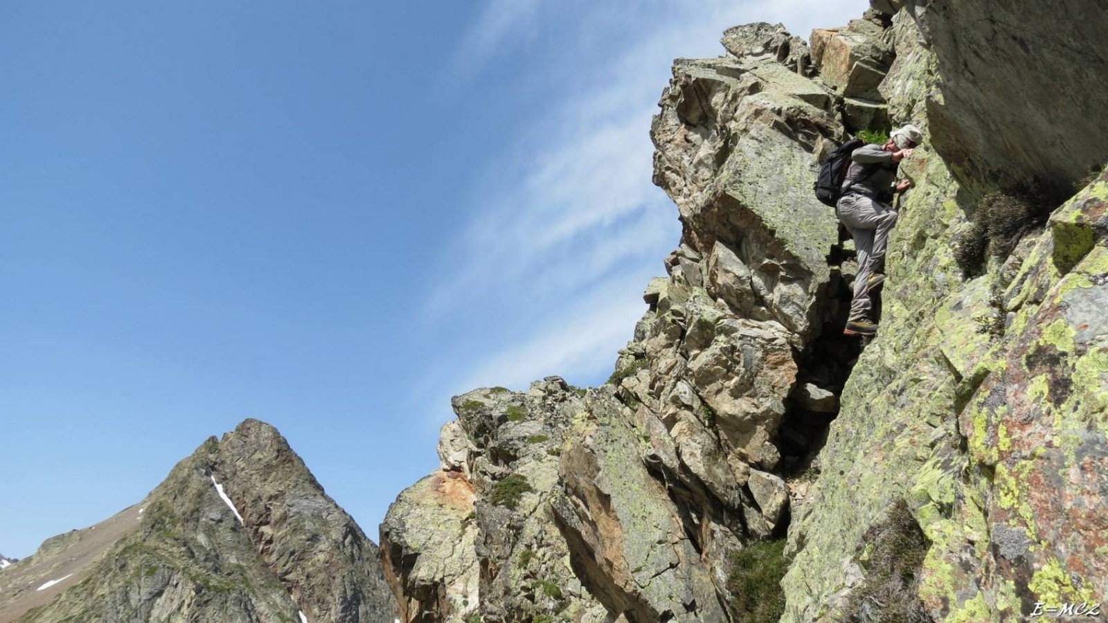 Deuxième tentative en traversant le grand couloir, par une descente en terrain raide pour rejoindre un replat facile pour franchir le thalweg puis une petite montée facile jusqu'à l'arête que j'ai remontée en croyant atteindre le sommet. L'altimètre, que j'avais calibré peu avant, m'indiquant un mètre de moins que la carte IGN. Le véritable sommet semblait être un peu plus au nord. Descente en suivant la crête vers une petite brèche, passage sur le versant sud, on a suivi une vire étroite puis j'ai remonté un petit mur muni de bonnes prises pour venir buter sur la dernière brèche à quelques mètres du sommet, de nouveau infranchissable pour moi sans matériel.